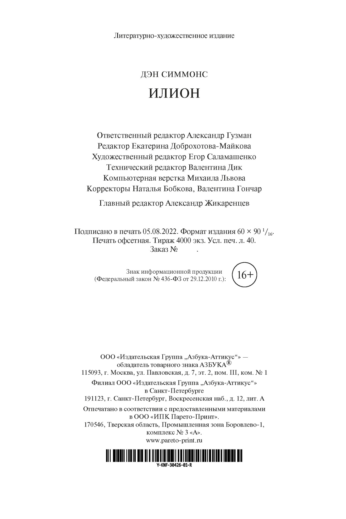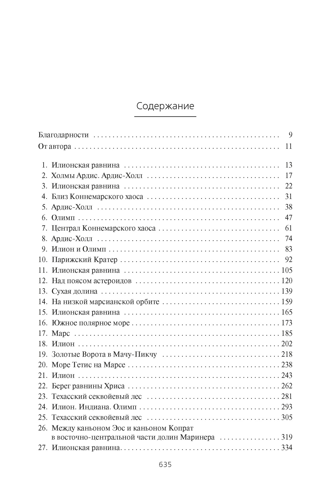 Современный классик Дэн Симмонс - прославленный автор «Террора», «Друда» и «Пятого сердца», фантастической эпопеи «Гиперион» / «Эндимион», «Темной игры смерти» и «Лета ночи», лауреат и финалист почти сотни престижных литературных наград в самых разных жанрах («Хьюго», «Небьюла», Всемирная премия фэнтези, премия имени Брэма Стокера, премия журнала «Локус», премия имени Артура Кларка, премия Британской ассоциации научной фантастики, а также многие другие, в том числе японские, немецкие, французские, итальянские, испанские награды). В дилогии «Троя», составленной романами «Илион» и «Олимп», он наконец вернулся к жанру, прославившему его в начале карьеры, - масштабной космической оперы со множеством аллюзий из классической литературы. Здесь разумные роботы-моравеки, отправившись от лун Юпитера исследовать аномальную квантовую активность Марса, обсуждают в пути сравнительные достоинства Шекспира и Пруста; здесь олимпийские боги, пользующиеся всеми чудесами нанотехнологии, отправляют воскрешенных ученых-схолиастов наблюдать за ходом Троянской войны; здесь постлюди оставляют на Земле всего миллион человек, и вот в имение Ардис-Холл, намереваясь соблазнить юную Аду, прибывает некий собиратель бабочек… Перевод публикуется в новой редакции.| Издательство | Азбука |