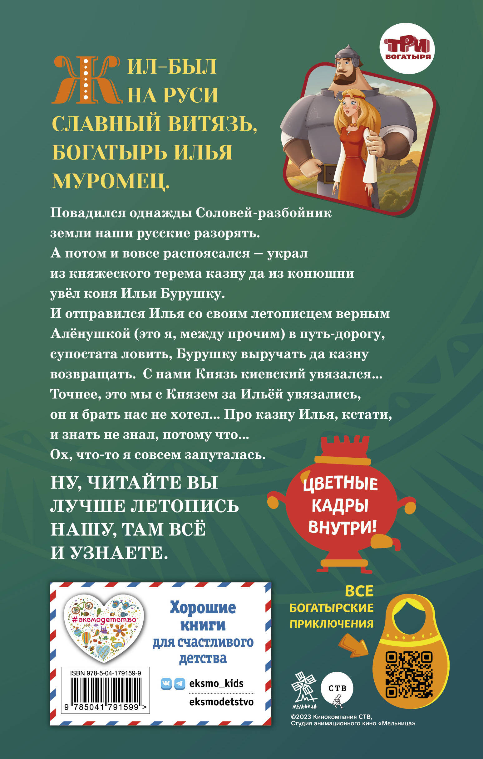 Новинка по мотивам любимого мультфильма «Илья Муромец и Соловей-разбойник. История Ильи и Алёнушки»! Теперь можно не только посмотреть любимую историю, но и прочитать! Рассказ ведут сами главные герои - богатырь Илья и девица-летописец Алёнушка. Они поведают, как Соловей-разбойник украл княжескую казну и увёл любимого коня Ильи - Бурушку. Пришлось Илье с Алёнушкой и князем киевским ехать в Царьград, чтобы вызволить Бурушку, спасти казну, а по пути новых подвигов богатырских насовершать. В этой книге вас ждёт: - необычный взгляд на любимую историю - её рассказывает от первого лица сам главный герой; - захватывающие приключения и добрый юмор; - удобный для начинающего читателя шрифт и формат; - вклейка с цветными кадрами из мультфильма. Эта книга станет отличным подарком поклоннику мультфильма, а также любому юному читателю, который только открывает для себя мир книг. Идеально для 7-10 лет!| Издательство | ООО "Издательство "Эксмо" |