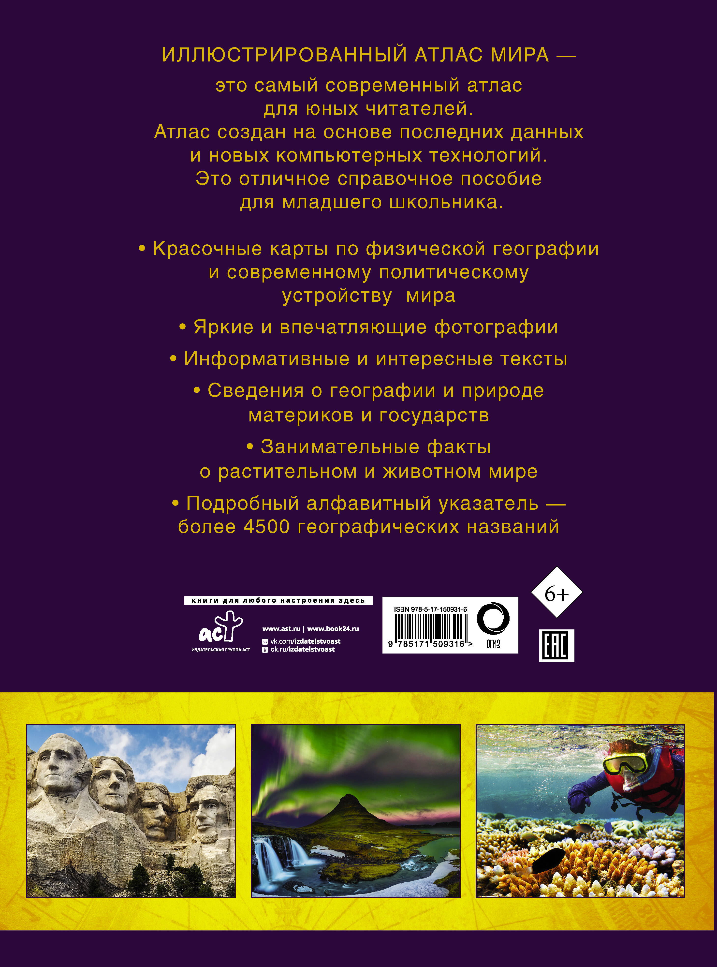 Иллюстрированный атлас мира - это самый современный атлас для юных читателей. На красочных страницах этой книги - материки, страны и их столицы, тайны океанов, богатство растительного и животного мира. В доступной и увлекательной форме атлас знакомит читателя с народами мира, их богатой историей и культурой, достопримечательностями и национальной кухней. Иллюстрированный атлас мира - незаменимое справочное пособие для младшего школьника. Подписи в атласе даны крупным шрифтом. Рекомендуем детям от 6 лет. Узнайте больше о нашей планете - откройте наш Иллюстрированный атлас мира. Книгу выбирают детям на подарок к окончанию детского сада, перед первым классом, новая лучшая для школьника, красивый полезный подарок, обо всем на свете, земля, планета, наша родина, мир, яркие страницы, современно, выпускной, развивайка, атлас.| Издательство | ИЗДАТЕЛЬСТВО "АСТ" |