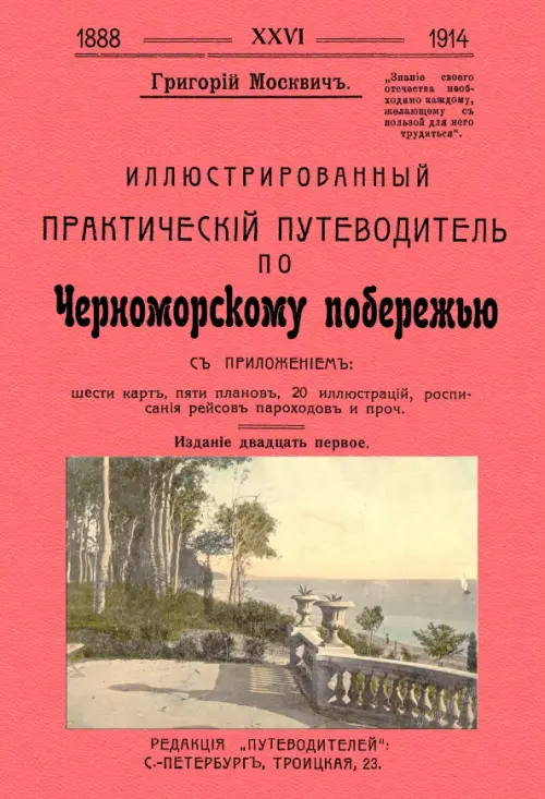 Репринт с издания. СПб. , 1914. С 10 цветными картами на 9 листах. С приложением: шести карт, пяти планов, 20 иллюстраций, расписания рейсов пароходов и проч. Издание 21. Москвич Григорий Георгиевич (1860, Ялта - 1942 там же) В 1888 году основал издательство путеводителей. Всего им было выпущено 15 путеводителей, которые вместе выдержали 223 издания. Он в начале XX века переехал в Санкт-Петербург. Здесь Г. Москвич основал издательство «Русский Бедекер». Г. Москвич был одним из первых туристических операторов России. Он организовывал туристические поездки на теплоходах, поездах, автомобилях, верховых лошадях, пешие походы (в которых сам принимал участие). Создал первые экскурсионные бюро на Кавказе. Путеводители, изданные нами: Иллюстрированный практический путеводитель по Крыму (2 издания: в обычном формате и карманном с другого издания); Иллюстрированный практический путеводитель по Севастополю и окрестностям; Иллюстрированный практический путеводитель по Черноморскому побережью; Иллюстрированный практический путеводитель по Москве; Путеводитель по курортам Кубани и Черноморья. Тираж 30 экз. выполнен по технологии print-on-demand.