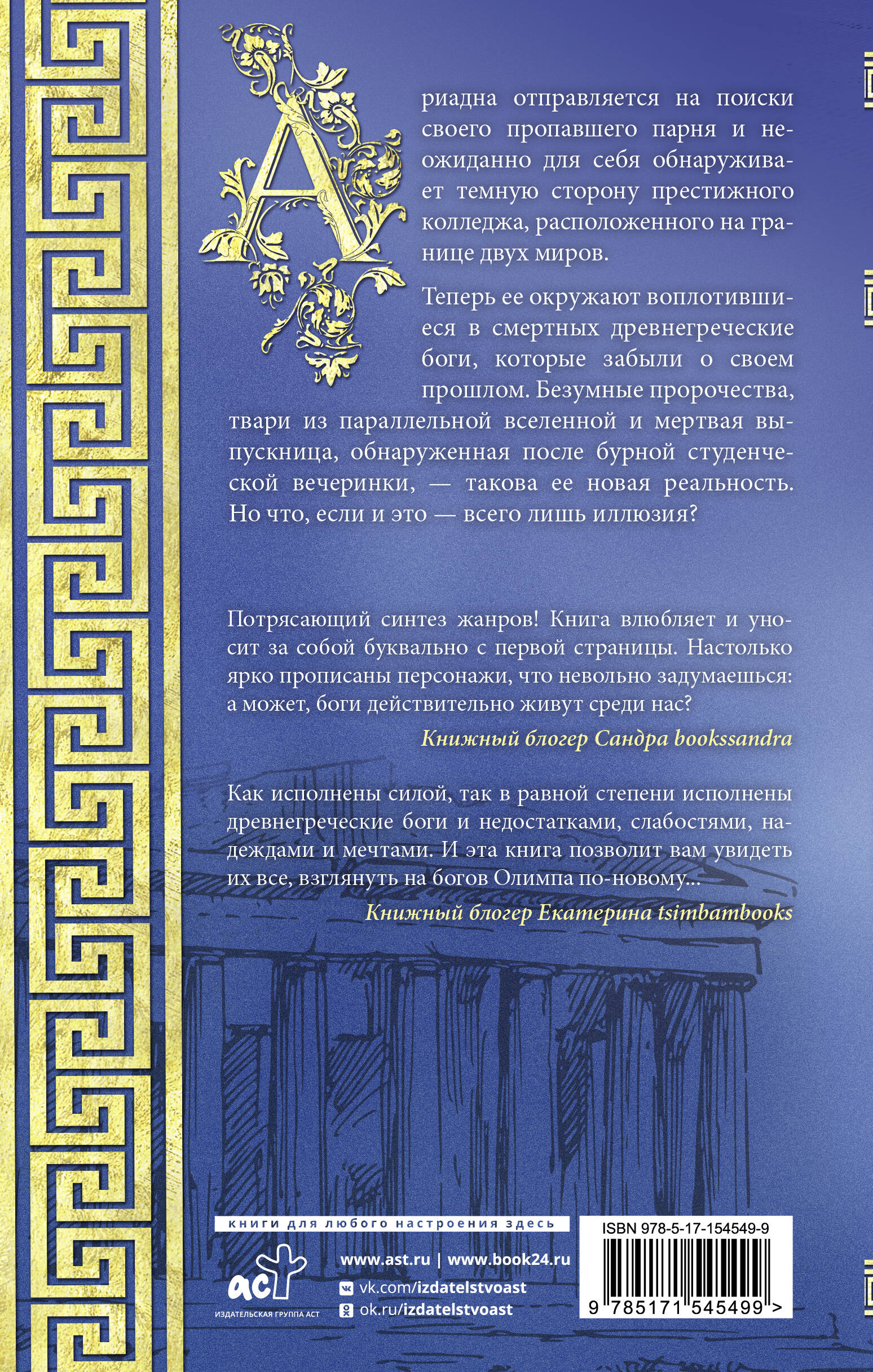 Ариадна отправляется на поиски своего пропавшего парня и неожиданно для себя обнаруживает темную сторону престиж- ного колледжа, расположенного на границе двух миров. Теперь ее окружают воплотившиеся в смертных древнегре- ческие боги, которые забыли о своем прошлом. Безумные про- рочества, твари из параллельной вселенной и мертвая выпуск- ница, обнаруженная после бурной студенческой вечеринки, - такова ее реальность. Но что, если и это - всего лишь иллюзия?| Издательство | ИЗДАТЕЛЬСТВО "АСТ" |