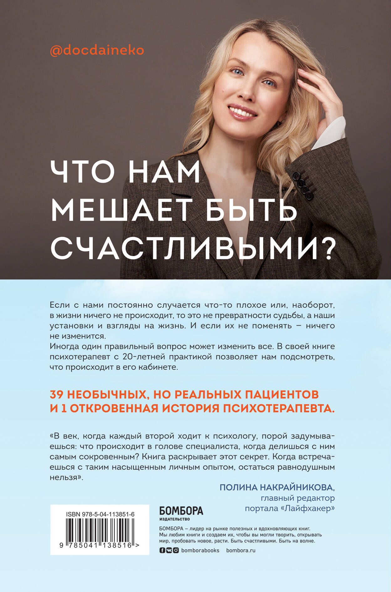 Ирина Дайнеко - практикующий врач-психотерапевт, более 20 лет практики. Автор колонки в журнале «Сноб». Что нам мешает быть счастливыми? Если с нами постоянно случается что-то плохое или, наоборот, в жизни ничего не происходит, то это не превратности судьбы, а наши установки и взгляды на жизнь, сформированные в детстве и юности. Они работают как фильтры или как шоры. И если эти установки не поменять ─ ничего не изменится. Иногда один правильный вопрос может поменять все. В своей книге психотерапевт с 20-летней практикой позволяет подсмотреть, что происходит в кабинете психотерапевта. В книге 39 необычных, но реальных пациентов и 1 откровенная история психотерапевта: - «Терплю, потому что боюсь остаться одна!» - Как победить страх одиночества и построить здоровые отношения. - «Мне совершенно ничего не хочется делать. Вообще ничего» - Откуда берутся депрессии. - «Моему сыну 30, у него нет девушки». - К чему приводит тотальный контроль за детьми и боязнь их отпустить. - «Мне 30 лет, и я не знаю кем хочу стать, когда вырасту». - Почему все больше молодых людей откладывают взросление на потом. - «Только не как у мамы!» - Как личная жизнь родителей может повлиять на выбор детей. - «У меня не получится!» - Как страх перед ошибкой мешает нам расти и развиваться. - «Лучше быть одному». - Как вернуть доверие к людям, если вас предали. Эта книга о поисках смысла жизни, родительских сценариях, непростом детстве, безответной любви и неприятии себя. Эта книга о людях, которые считали себя несчастными, нашли в себе силы прийти на прием и разобраться в себе.| Издательство | ООО "Издательство "Эксмо" |