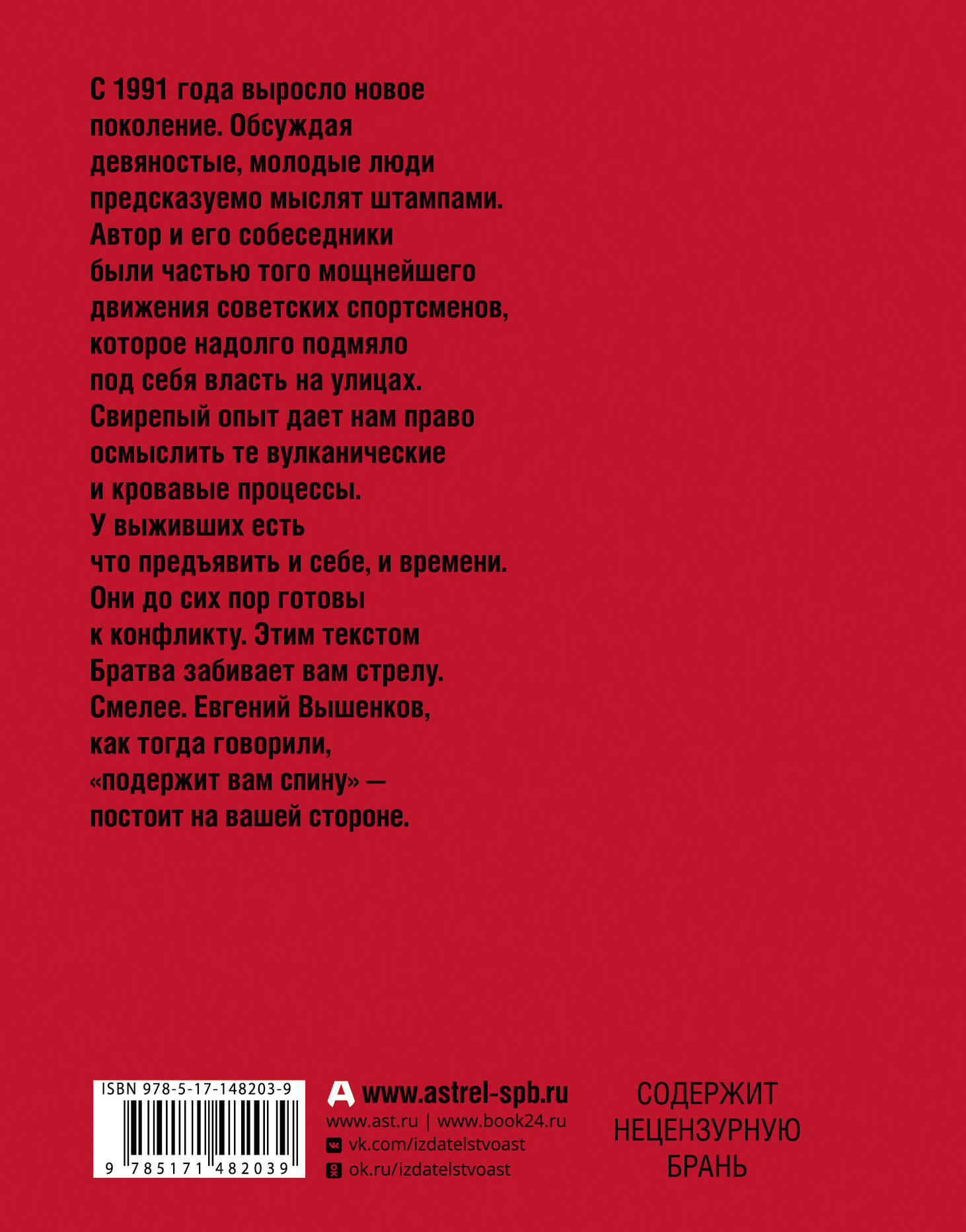 С 1991 года выросло новое поколение. Обсуждая девяностые, молодые люди предсказуемо мыслят штампами. Автор и его собеседники были частью того мощнейшего движения советских спортсменов, которое надолго подмяло под себя власть на улицах. Свирепый опыт дает нам право осмыслить те вулканические и кровавые процессы. У выживших есть что предъявить и себе, и времени. Они до сих пор готовы к конфликту. Этим текстом Братва забивает вам стрелу. Смелее. Евгений Вышенков, как тогда говорили, "подержит вам спину" - постоит на вашей стороне.| Издательство | ИЗДАТЕЛЬСТВО "АСТ" |
