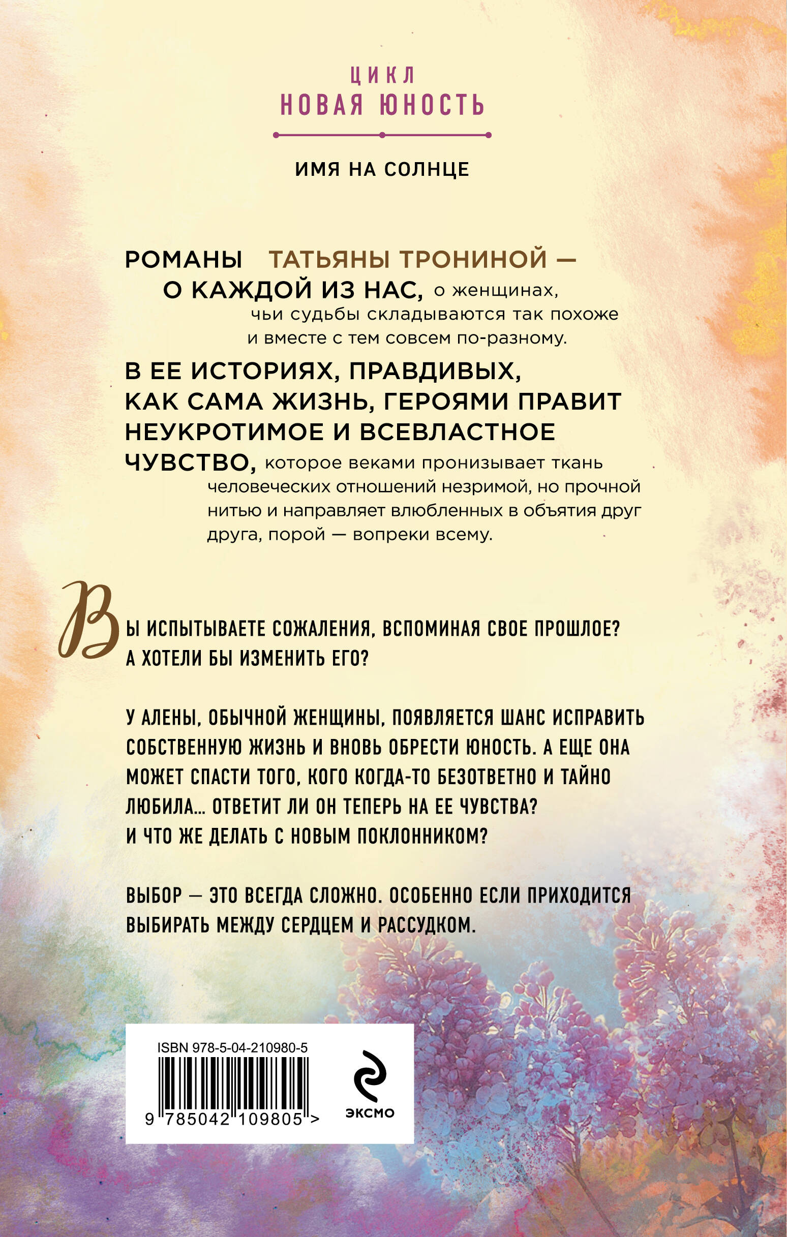 Очередная невероятная и романтичная история от Татьяны Трониной. Взрывной микс жанров и уютная, «ламповая» атмосфера прошлого. Обычная женщина из наших дней попадает в прошлое, становится юной красавицей, спортсменкой, комсомолкой! Поможет ли героине опыт ее долгой жизни? Или вновь обретенная молодость способна разрушить все доводы рассудка? Первая книга цикла «Новая юность».