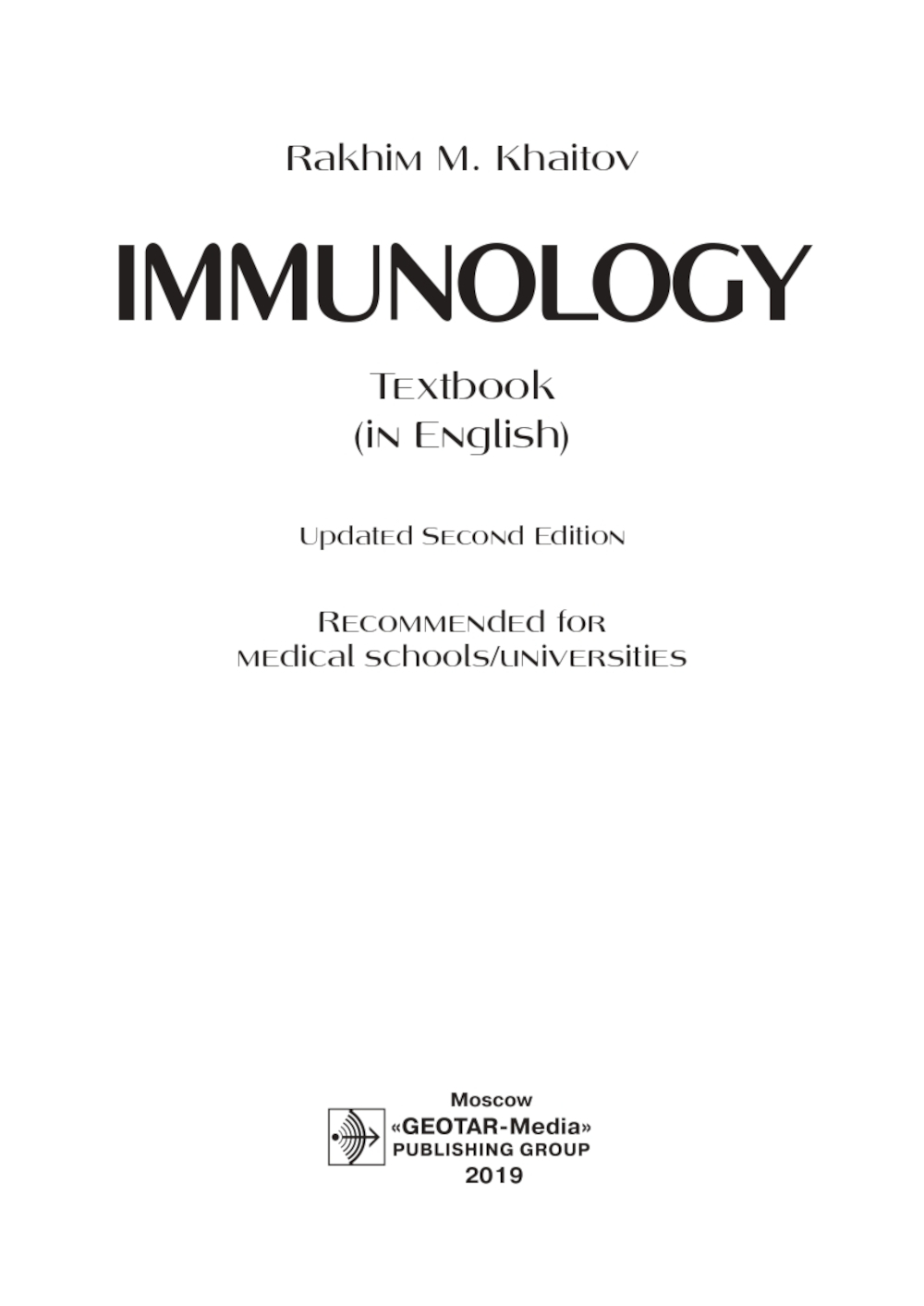 The textbook provides essential information on all aspects of structure and functions of the immune system under normal and pathological conditions. The knowledge about innate immunity and the mechanisms of adaptive immunity formation is presented at the organismal, cellular, and molecular levels. Information is provided about the immune cell populations, the structure of immune receptors, the intracellular signaling pathways, major histocompatibility complex (MHC), immunity genetic control, and immunological memory. The immune deficiencies, allergic and autoimmune diseases are reviewed. An overview of clinical use of immunotropic drugs is presented.