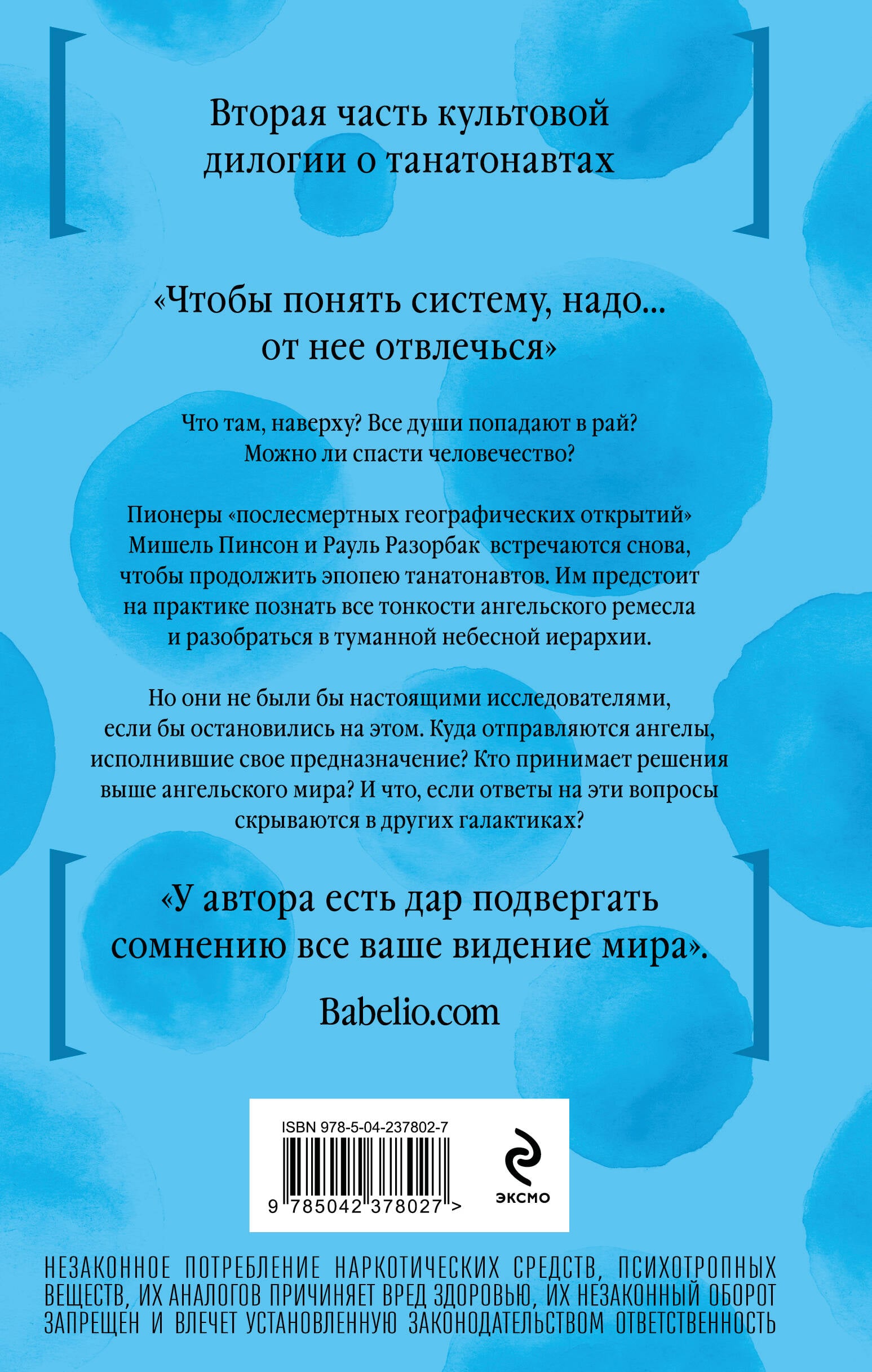 НЕЗАКОННОЕ ПОТРЕБЛЕНИЕ НАРКОТИЧЕСКИХ СРЕДСТВ, ПСИХОТРОПНЫХ ВЕЩЕСТВ, ИХ АНАЛОГОВ ПРИЧИНЯЕТ ВРЕД ЗДОРОВЬЮ, ИХ НЕЗАКОННЫЙ ОБОРОТ ЗАПРЕЩЕН И ВЛЕЧЕТ УСТАНОВЛЕННУЮ ЗАКОНОДАТЕЛЬСТВОМ ОТВЕТСТВЕННОСТЬ. Знаменитый роман Бернара Вербера в новом оформлении! «Чтобы понять систему, надо… от нее отвлечься». Что там, наверху? Все души попадают в рай? Можно ли спасти человечество? Пионеры «послесмертных географических открытий» Мишель Пинсон и Рауль Разорбак встречаются снова, чтобы продолжить эпопею танатонавтов. Им предстоит на практике познать все тонкости ангельского ремесла и разобраться в туманной небесной иерархии. Но они не были бы настоящими исследователями, если бы остановились на этом. Куда отправляются ангелы, исполнившие свое предназначение? Кто принимает решения выше ангельского мира? И что, если ответы на эти вопросы скрываются в других галактиках? «У автора есть дар подвергать сомнению все ваше видение мира». - Babileo| Издательство | ООО "Издательство "Эксмо" |