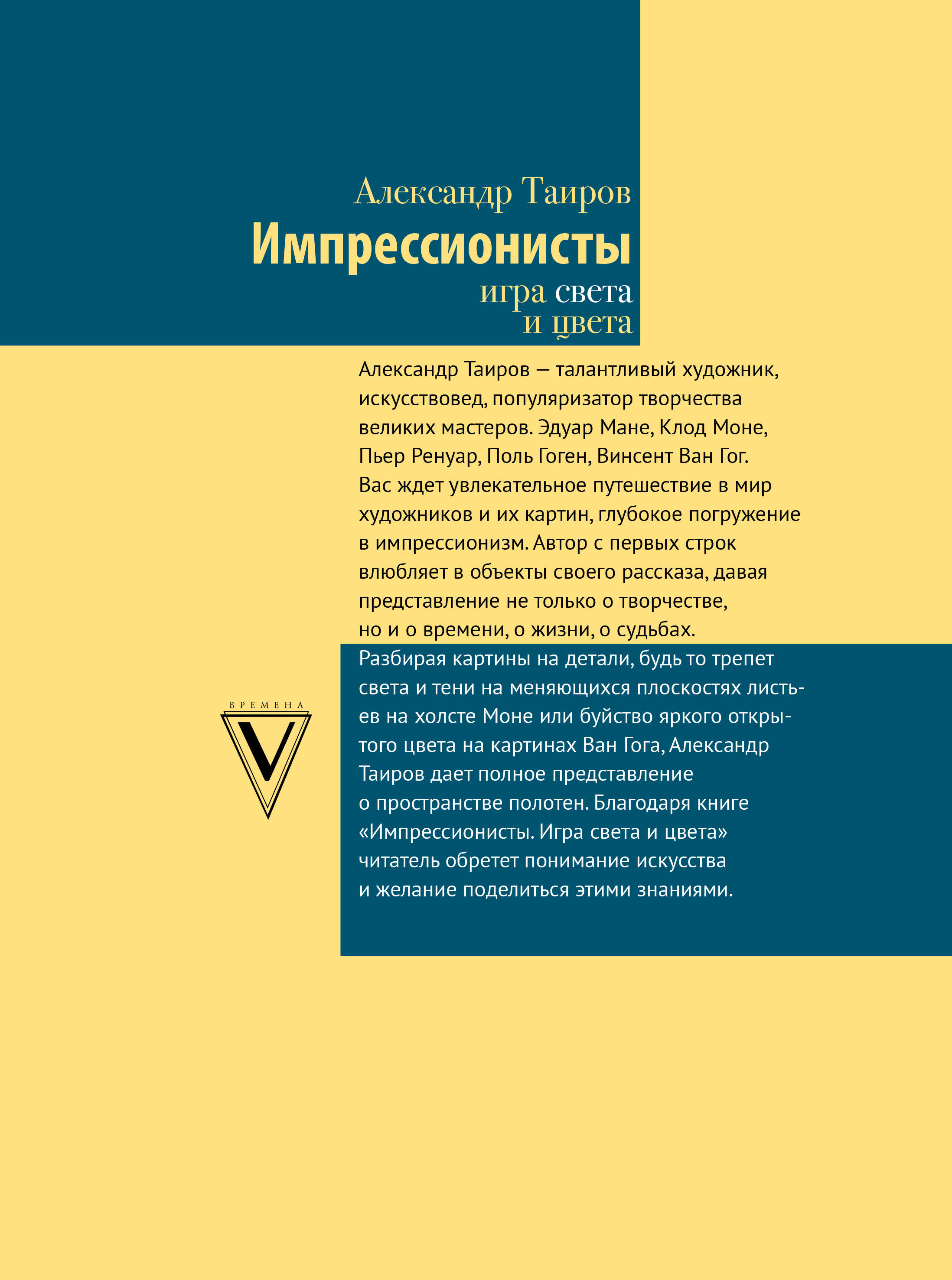 Александр Таиров - талантливый художник, искусствовед, популяризатор творчества великих мастеров. Эдуар Мане, Клод Моне, Пьер Ренуар, Поль Гоген, Винсент Ван Гог. Вас ждет увлекательное путешествие в мир художников и их картин, глубокое погружение в импрессионизм. Автор с первых строк влюбляет читателя в своих героев, давая представление не только о творчестве, но и о времени, о жизни, о судьбах. Раскладывая картины на детали, будь то трепет света и тени на меняющихся плоскостях листьев на холсте Моне или буйство яркого открытого цвета на картинах Ван Гога, Александр Таиров дает полное представление о пространстве полотен, их композиционном построении, а также сюжетном исполнении.| Издательство | ИЗДАТЕЛЬСТВО "АСТ" |