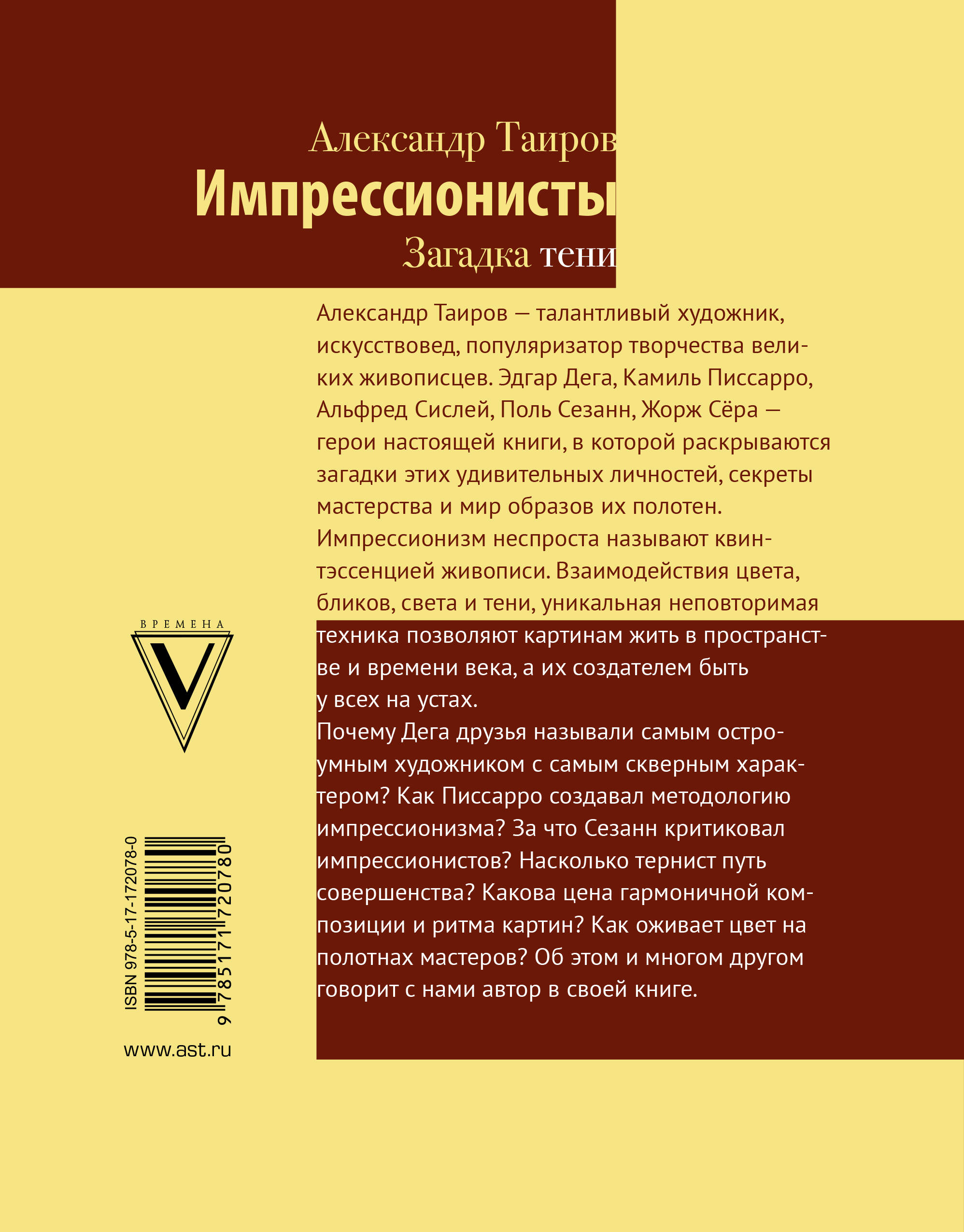 Александр Таиров - талантливый художник, искусствовед, популяризатор творчества великих живописцев. Эдгар Дега, Камиль Писсарро, Альфред Сислей, Поль Сезанн, Жорж Сёра - герои настоящей книги, в которой раскрываются загадки этих удивительных личностей, секреты мастерства и мир образов их полотен. Импрессионизм неспроста называют квинтэссенцией живописи. Взаимодействия цвета, бликов, света и тени, уникальная неповторимая техника позволяют картинам жить в пространстве и времени века, а их создателем быть у всех на устах. Почему Дега друзья называли самым остроумным художником с самым скверным характером? Как Писсарро создавал методологию импрессионизма? За что Сезанн критиковал импрессионистов? Насколько тернист путь совершенства? Какова цена гармоничной композиции и ритма картин? Как оживает цвет на полотнах мастеров? Об этом и многом другом говорит с нами автор в своей книге.