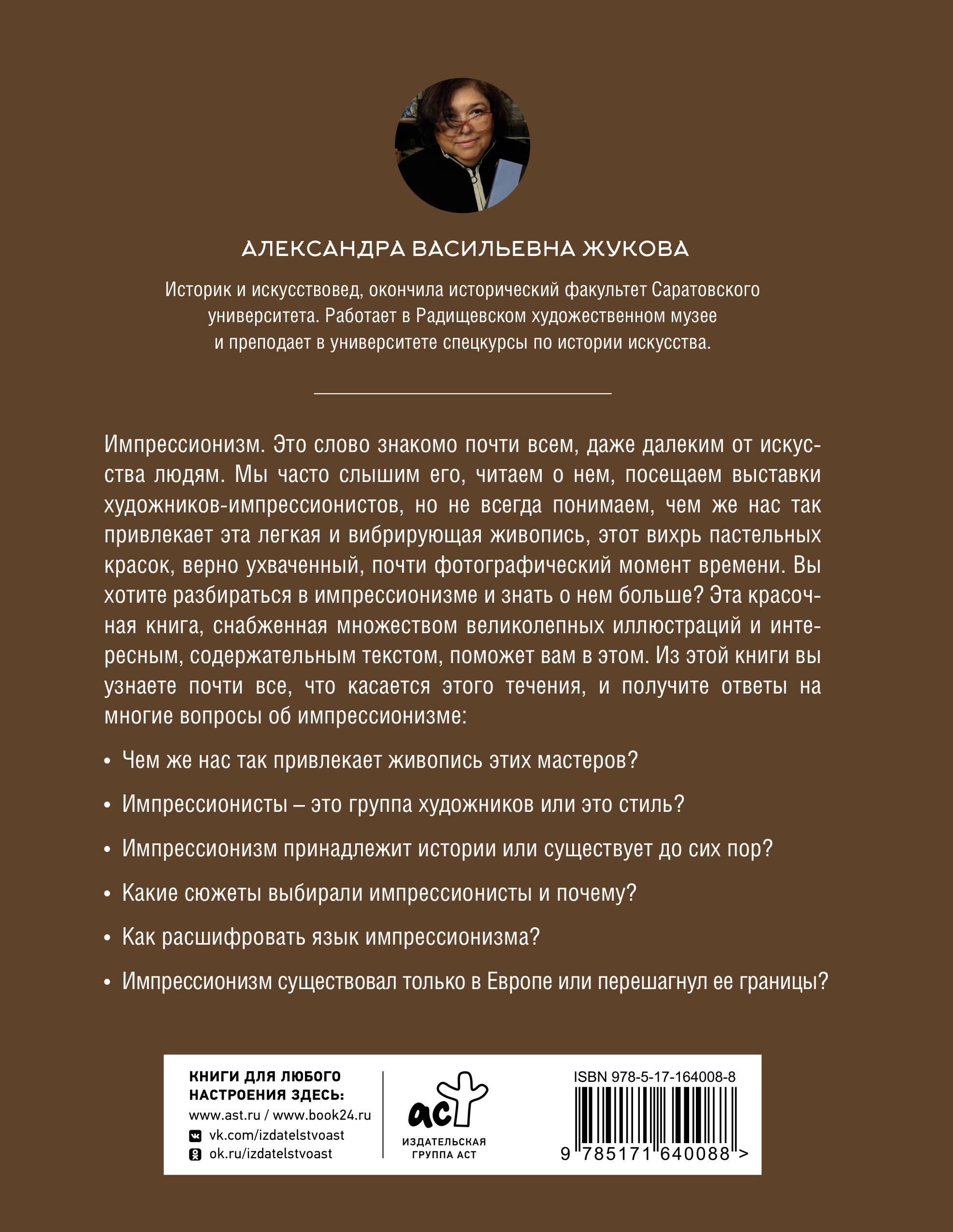 Импрессионизм. Это слово знакомо почти всем, даже далеким от искусства людям. Мы часто слышим его, читаем о нем, посещаем выставки художников-импрессионистов, но не всегда понимаем, чем же нас так привлекает эта легкая и вибрирующая живопись, этот вихрь пастельных красок, верно ухваченный, почти фотографический момент времени. Вы хотите разбираться в импрессионизме и знать о нем больше? Эта красочная книга, снабженная множеством великолепных иллюстраций и интересным, содержательным текстом, поможет вам в этом. Из этой книги вы узнаете почти все, что касается этого течения, и получите ответы на многие вопросы об импрессионизме: Чем же нас так привлекает живопись этих мастеров? Импрессионисты - это группа художников или это стиль? Импрессионизм принадлежит истории или существует до сих пор? Какие сюжеты выбирали импрессионисты и почему? Как расшифровать язык импрессионизма? Импрессионизм существовал только в Европе или перешагнул ее границы? Давайте всмотримся в картины импрессионистов, узнаем побольше о самих авторах, научимся читать и понимать их живопись.| Издательство | Издательство "АСТ" |