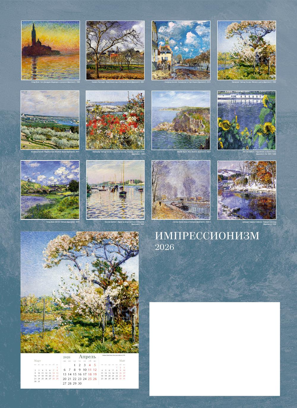 Умиротворяющие пейзажи, моменты красоты, случайные сцены городской жизни, выхваченные из бурлящего потока повседневности... Наш календарь - это уникальная галерея работ известных импрессионистов, позволяющая проникнуться их вдохновением, окунуться в море ярких красок и почувствовать себя по-настоящему живым. Размер 420х580 мм, 8 листов, плотная мелованная бумага 170 г/м2, глянцевая ламинация обложки, пружина на 1 ригеле, упакован в пакет с вырубными ручками.| Издательство | Контэнт-Канц |