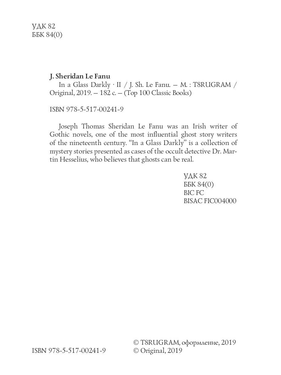 Joseph Thomas Sheridan Le Fanu was an Irish writer of Gothic novels, one of the most influential ghost story writers of the nineteenth century. "In a Glass Darkly" is a collection of mystery stories presented as cases of the occult detective Dr. Martin Hesselius, who believes that ghosts can be real.| Издательство | Т8 RUGRAM |