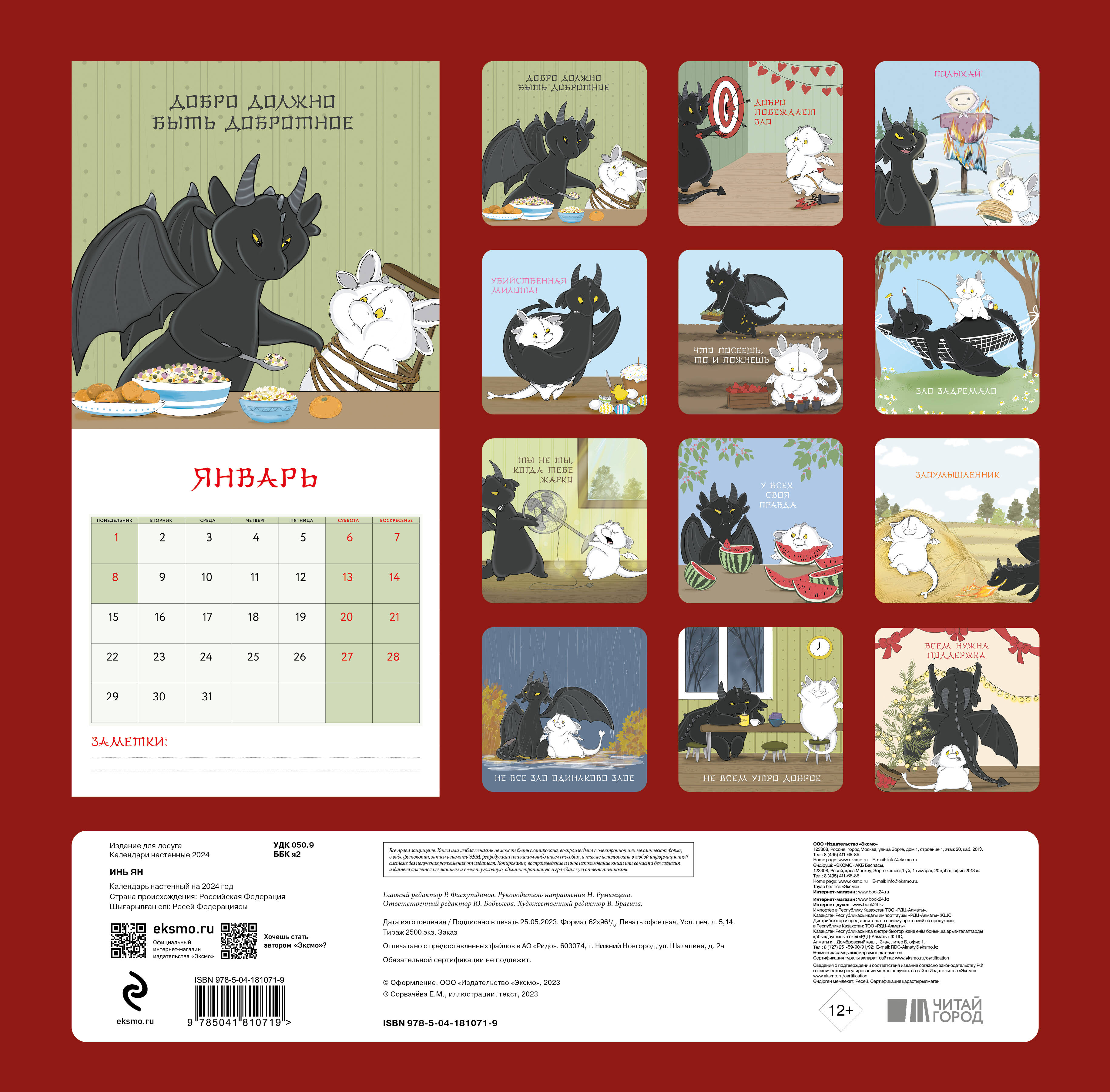 О серии: Наши настенные календари отличаются высоким качеством исполнения! Тщательно подобранные иллюстрации, напечатанные на глянцевой бумаге высочайшего качества, станут настоящим украшением дома, а в календарной сетке найдется место для ваших планов: большие клетки позволят делать записи и организовать свой год! В календаре также отмечены все государственные праздники. О календаре: Как принять себя, если ты - полный песец? Что делать, если удача бросает тебе вызов каждый день? Будь собой! Проживи этот год с огоньком! В календаре собраны головокружительные сюжеты из жизни неуклюжего и, на первый взгляд, не самого удачливого песца. Который, так же как ты, радуется, когда накупит вебинаров, страшно не выспается, потому что всю ночь слушает проблемы кота. Полный песец ближе, чем ты думаешь! Он ждет тебя! Для кого: Для всех поклонников творчества иллюстратора Екатерины Сорвачевой, продолжение календаря "Добро и зло" с новыми героями - Драконами, символами года. Технические параметры: - Тип календаря - настенный перекидной. - Год - 2024. - Календарная сетка - с разбивкой по месяцам. - Вид скрепления - скрепка. - Ширина - 30 см. - Высота - 30 см. - Внутренний блок - мелованная бумага 150 г/м2. - Подложка - плотный гофрокартон для поддержания формы. - Индивидуальная упаковка в плотный целлофановый пакет.| Издательство | ООО "Издательство "Эксмо" |