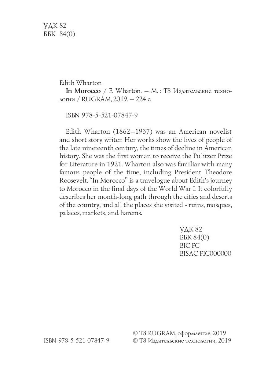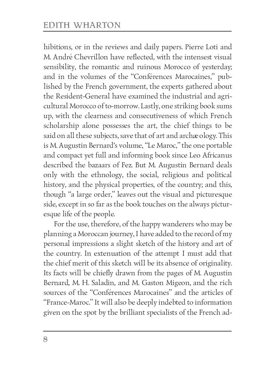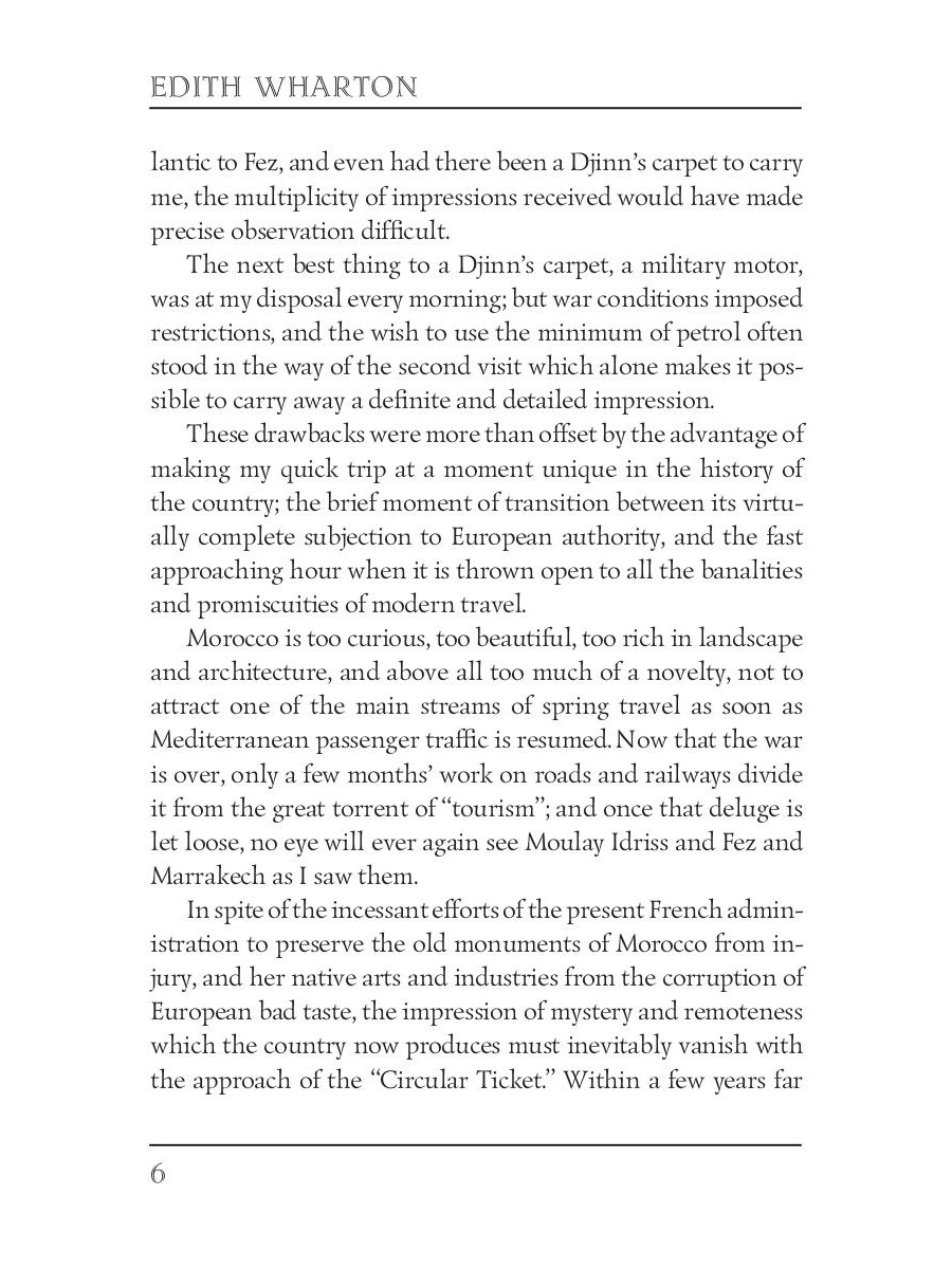 Edith Wharton (1862-1937) was an American novelist and short story writer. Her works show the lives of people of the late nineteenth century, the times of decline in American history. She was the first woman to receive the Pulitzer Prize for Literature in 1921. Wharton also was familiar with many famous people of the time, including President Theodore Roosevelt "In Morocco" is a travelogue about Edith's journey to Morocco in the final days of the World War I. It colorfully describes her month-long path through the cities and deserts of the country, and all the places she visited - ruins, mosques, palaces, markets, and harems.