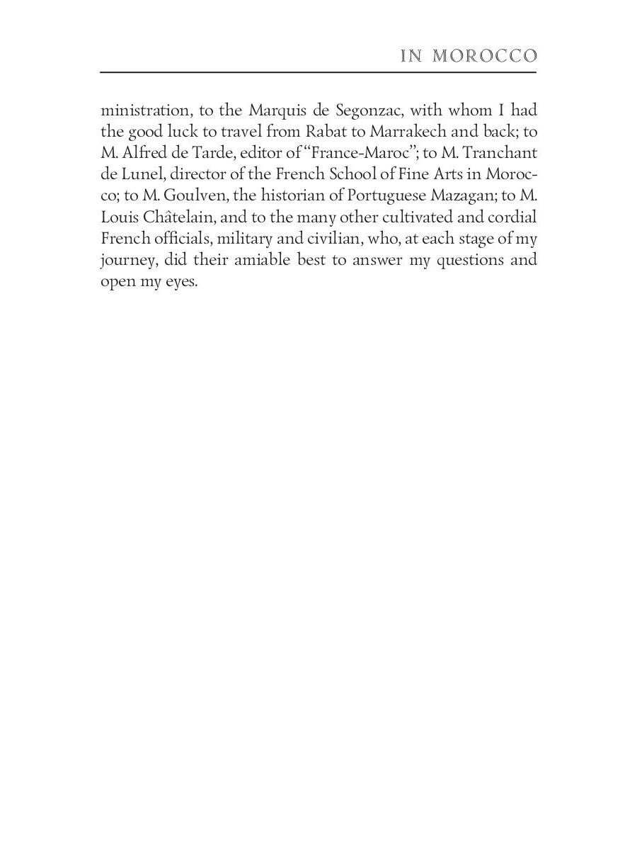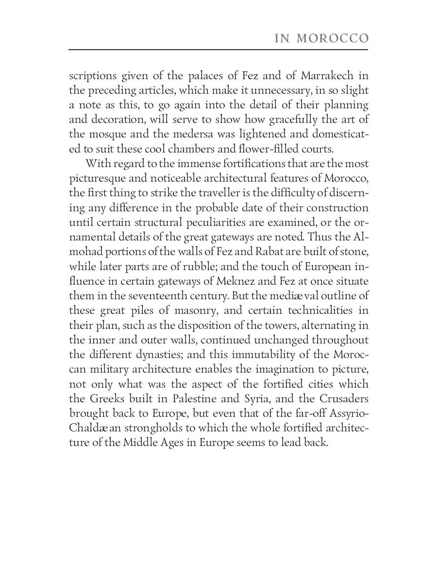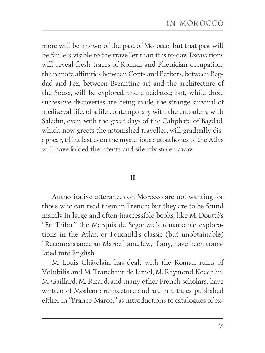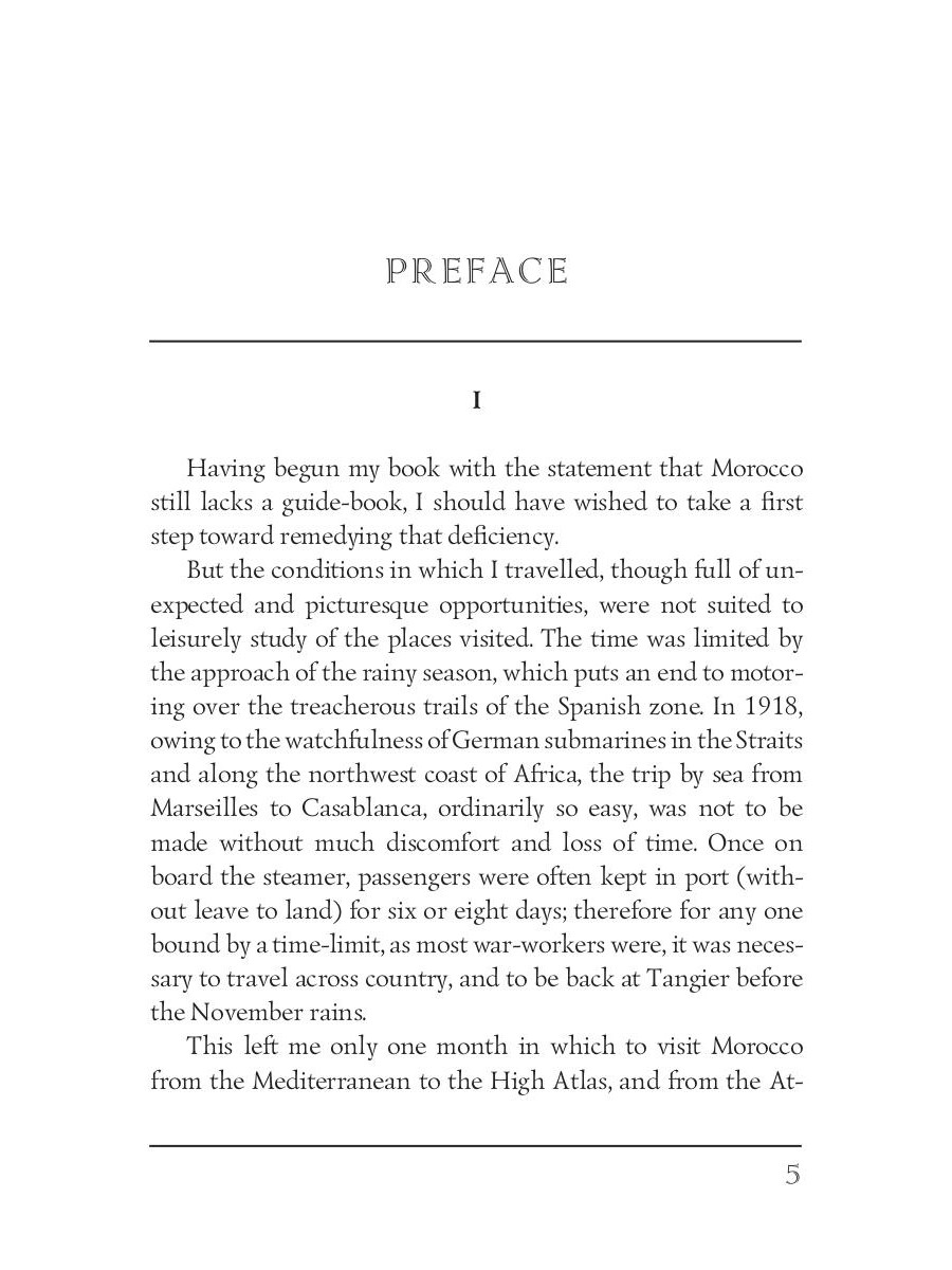 Edith Wharton (1862-1937) was an American novelist and short story writer. Her works show the lives of people of the late nineteenth century, the times of decline in American history. She was the first woman to receive the Pulitzer Prize for Literature in 1921. Wharton also was familiar with many famous people of the time, including President Theodore Roosevelt "In Morocco" is a travelogue about Edith's journey to Morocco in the final days of the World War I. It colorfully describes her month-long path through the cities and deserts of the country, and all the places she visited - ruins, mosques, palaces, markets, and harems.