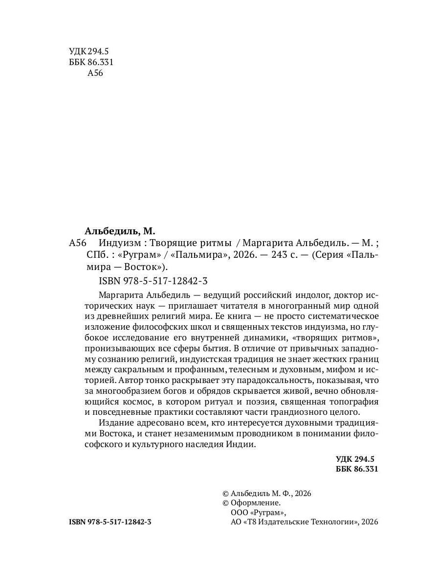Маргарита Альбедиль - ведущий российский индолог, доктор исторических наук - приглашает читателя в многогранный мир одной из древнейших религий мира. Ее книга - не просто систематическое изложение философских школ и священных текстов индуизма, но глубокое исследование его внутренней динамики, «творящих ритмов», пронизывающих все сферы бытия. В отличие от привычных западному сознанию религий, индуистская традиция не знает жестких границ между сакральным и профанным, телесным и духовным, мифом и историей. Автор тонко раскрывает эту парадоксальность, показывая, что за многообразием богов и обрядов скрывается живой, вечно обновляющийся космос, в котором ритуал и поэзия, священная топография и повседневные практики составляют части грандиозного целого. Издание адресовано всем, кто интересуется духовными традициями Востока, и станет незаменимым проводником в понимании философского и культурного наследия Индии.| Издательство | Т8 RUGRAM |