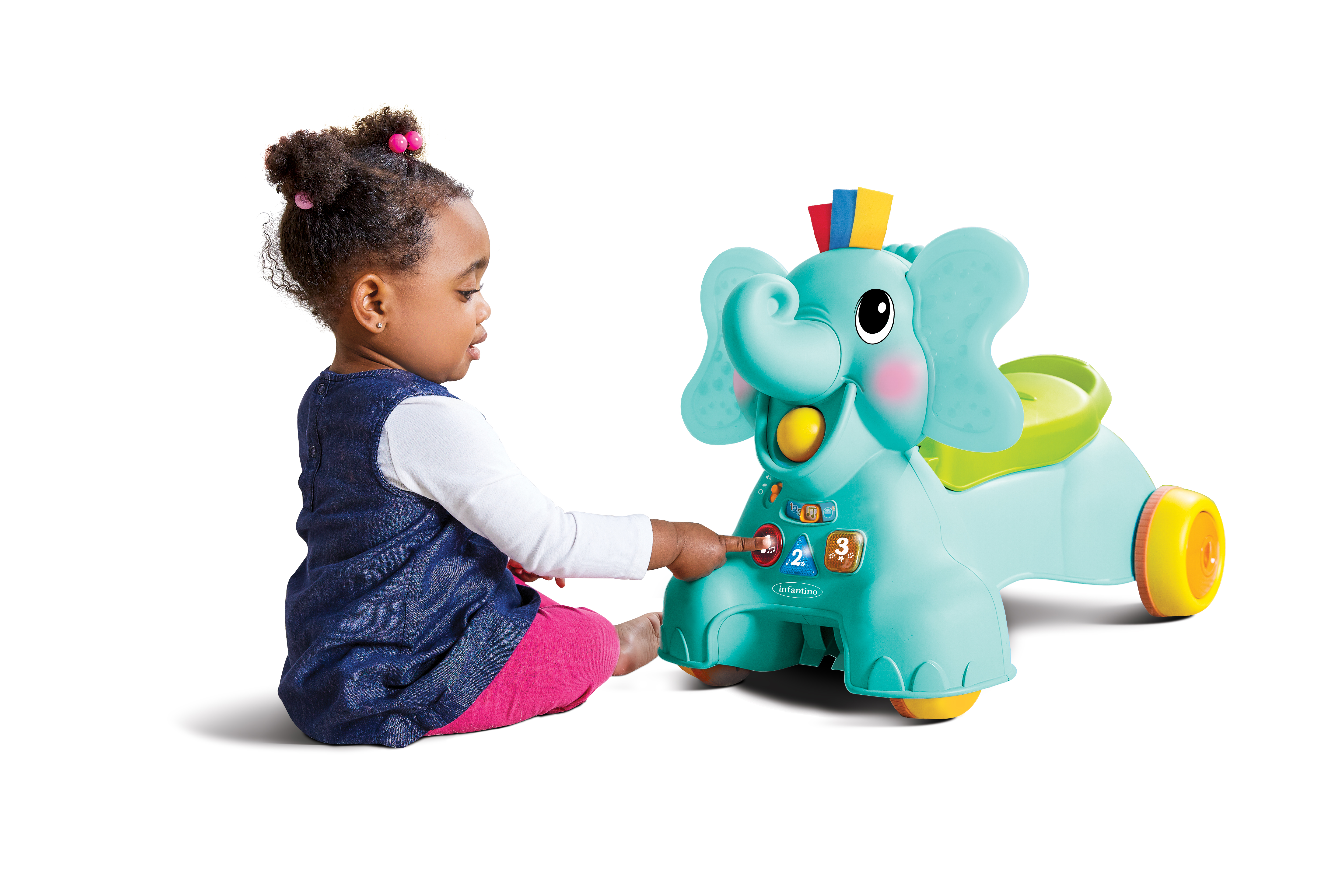 Infantino - это линейка продуктов для детей, полная веселья и продуманного дизайна, готового к ежедневным приключениям родителей в воспитании и развитии своих детей. Детские продукты Infantino помогают вам и вашим малышам расти вместе, и показывают, что процесс обучения и познания не должен быть сложным или утомительным. Игровой центр Слонёнок 3 в 1 - это невероятное развлечение, которое растет вместе с вашим малышом. Игровой центр имеет 3 способа игры: 1) Сядьте и исследуйте, для сидящих младенцев, множество практических занятий: кнопки с подсветкой, различные песенки и весёлые звуки. 2) Встаньте и идите. Когда ваш ребенок будет готов встать и ходить, поднимите сиденье за ручку, чтобы сделать первые шаги более устойчивыми и безопасными. Регулируемые настройки позволяют контролировать скорость вращения колеса по мере продвижения ребенка. 3) Езда на слонёнке. Просто опустите сиденье, когда ваш малыш будет готов кататься. Ваш малыш будет в восторге от увлекательного путешествия. Рекомендованный возраст: от 6 месяцев.