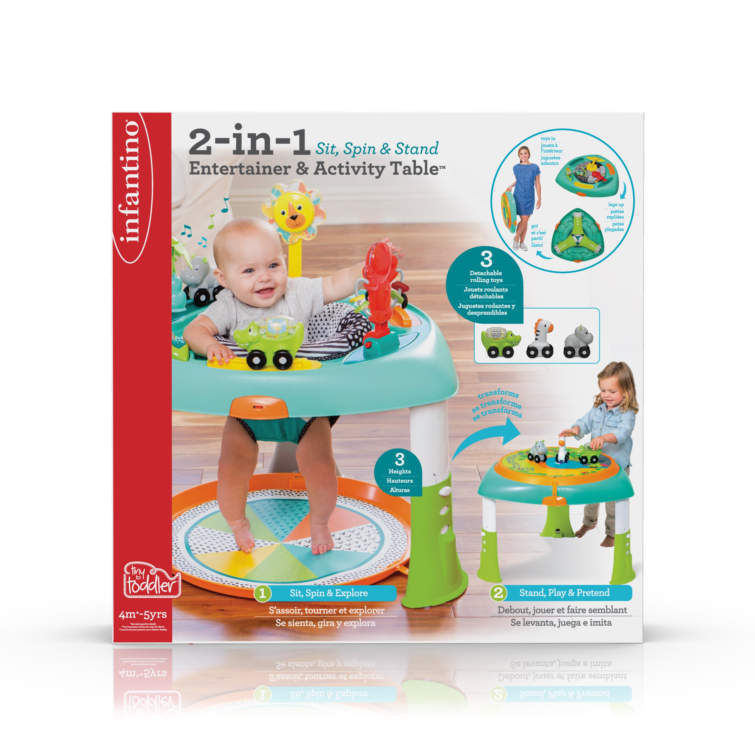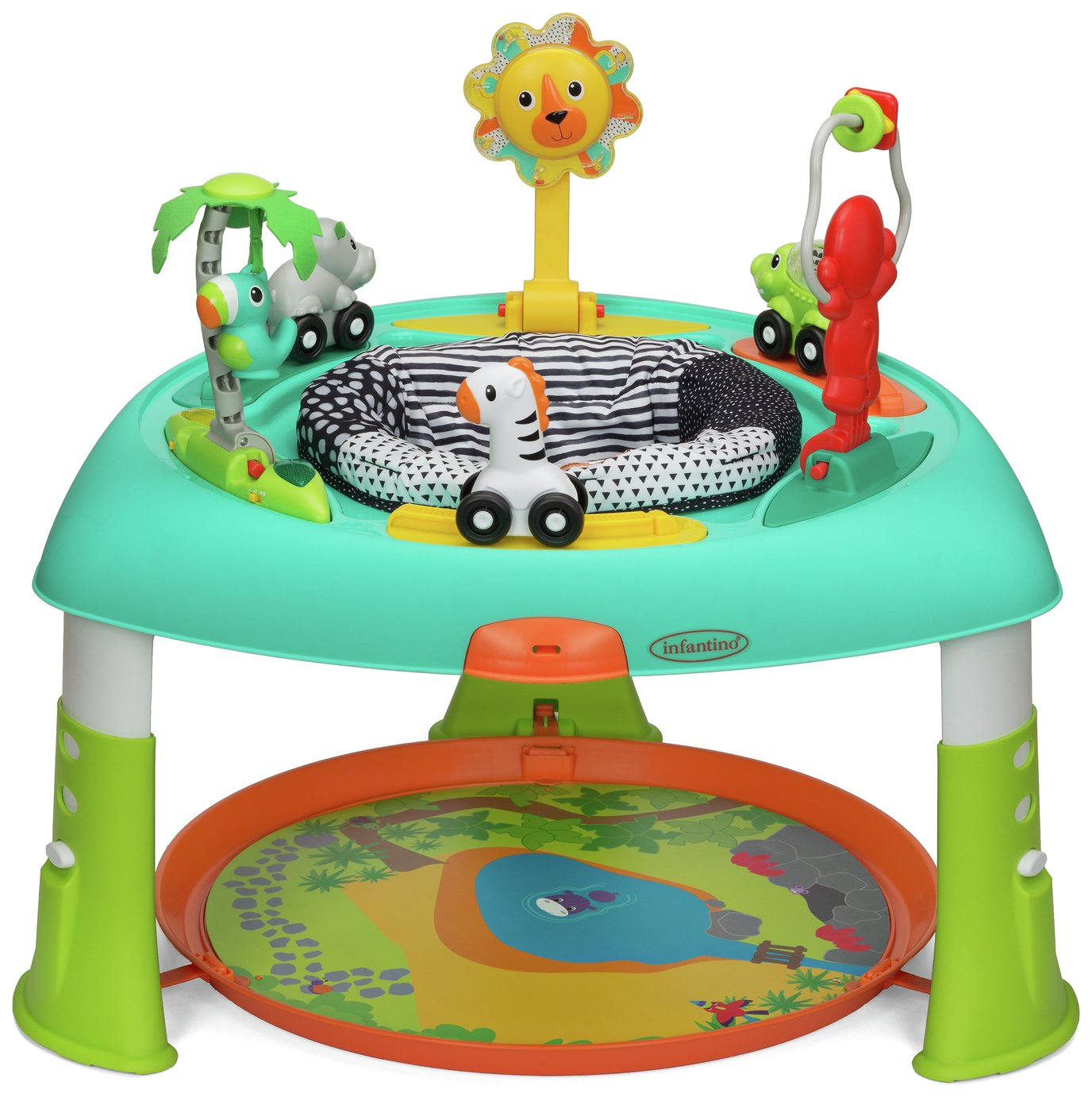 Infantino - это линейка продуктов для детей, полная веселья и продуманного дизайна, готового к ежедневным приключениям родителей в воспитании и развитии своих детей. Детские продукты Infantino помогают вам и вашим малышам расти вместе, и показывают, что процесс обучения и познания не должен быть сложным или утомительным. Возрастная категория от 4 месяцев до 5 лет. Развлекательный центр трансформируется в столик для игр и развлечений. Три положения высоты растут вместе с ребенком. В комплект входят 6 увлекательных игрушек со светящимися кнопками и музыкальными эффектами. Дети должны уметь сидеть вертикально без посторонней помощи. Как только дети смогут самостоятельно ходить, прекратите использовать это изделие в качестве сиденья и переключите его в режим столика.
