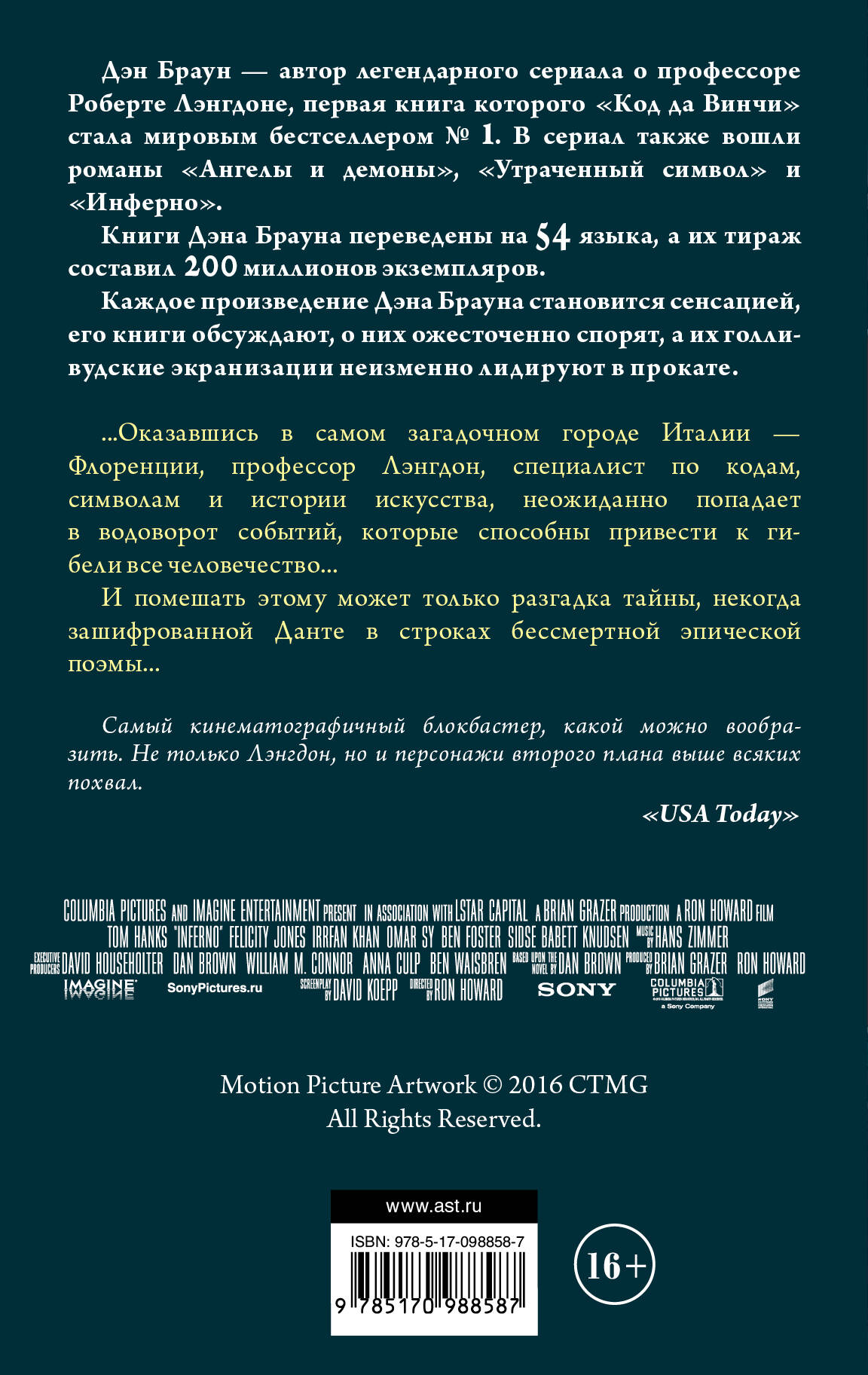 …Оказавшись в самом загадочном городе Италии - Флоренции, профессор Лэнгдон, специалист по кодам, символам и истории искусства, неожиданно попадает в водоворот событий, которые способны привести к гибели все человечество … И помешать этому может только разгадка тайны, некогда зашифрованной Данте в строках бессмертной эпической поэмы…