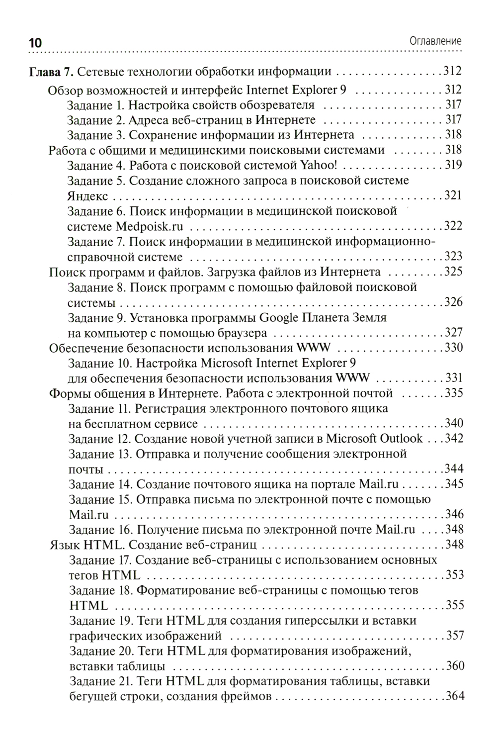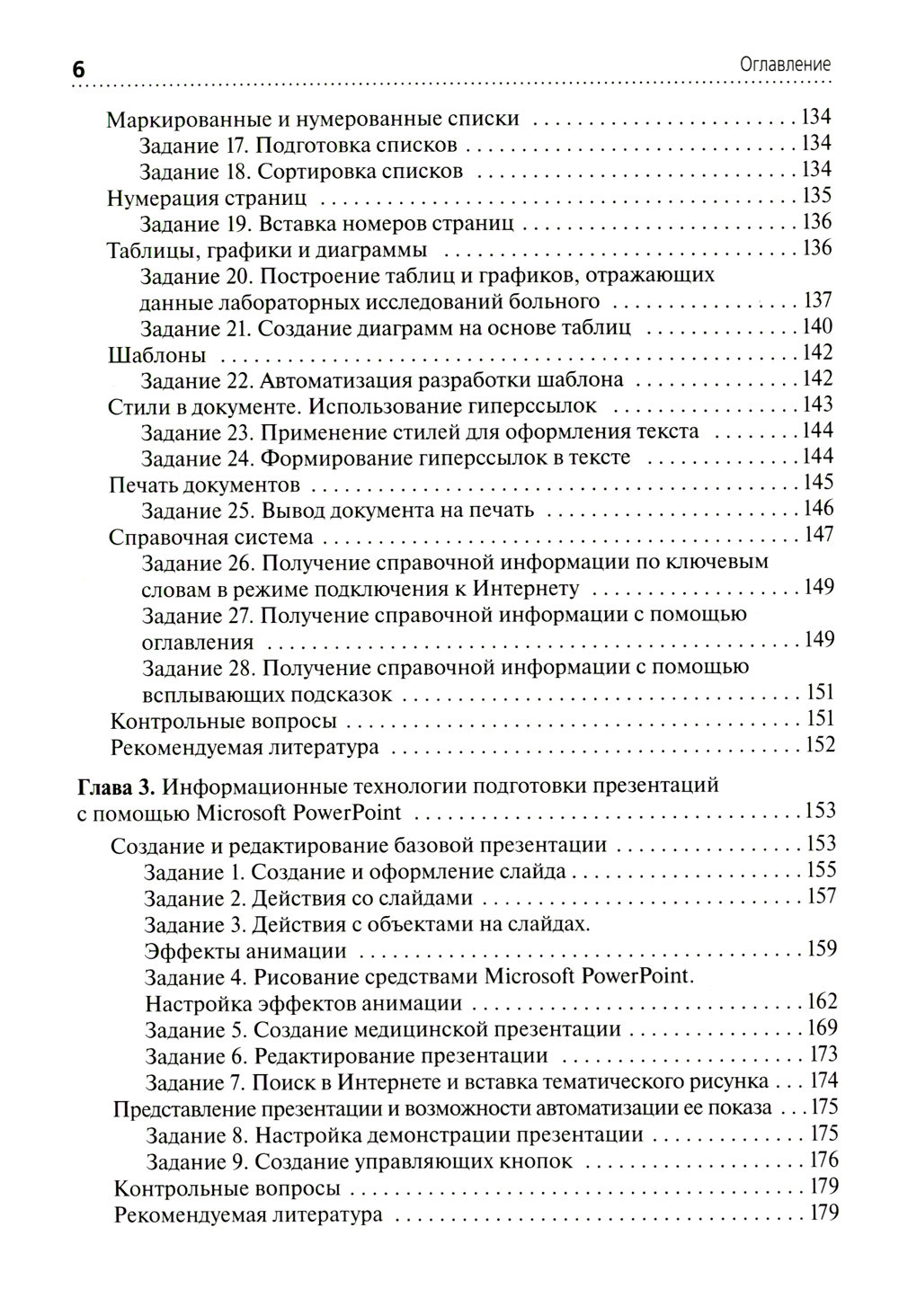Практикум - дополнение к учебнику В.П. Омельченко и А.А. Демидовой «Информационные технологии в профессиональной деятельности» для медицинских училищ и колледжей. Рассмотрено применение информационных технологий пакета Microsoft Office для подготовки текста, выполнения математических расчетов, создания медицинской базы данных и работы с ней, подготовки презентаций, а также использование Интернета для поиска медицинской информации, настройки, получения и отправки электронной почты и создания веб-страниц. Показаны возможности медицинских информационных систем для автоматизации работы медицинских учреждений. Издание предназначено учащимся медицинских и фармацевтических училищ и колледжей, а также может быть полезно студентам и аспирантам медицинских и фармацевтических вузов.| Издательство | ГЭОТАР-Медиа |