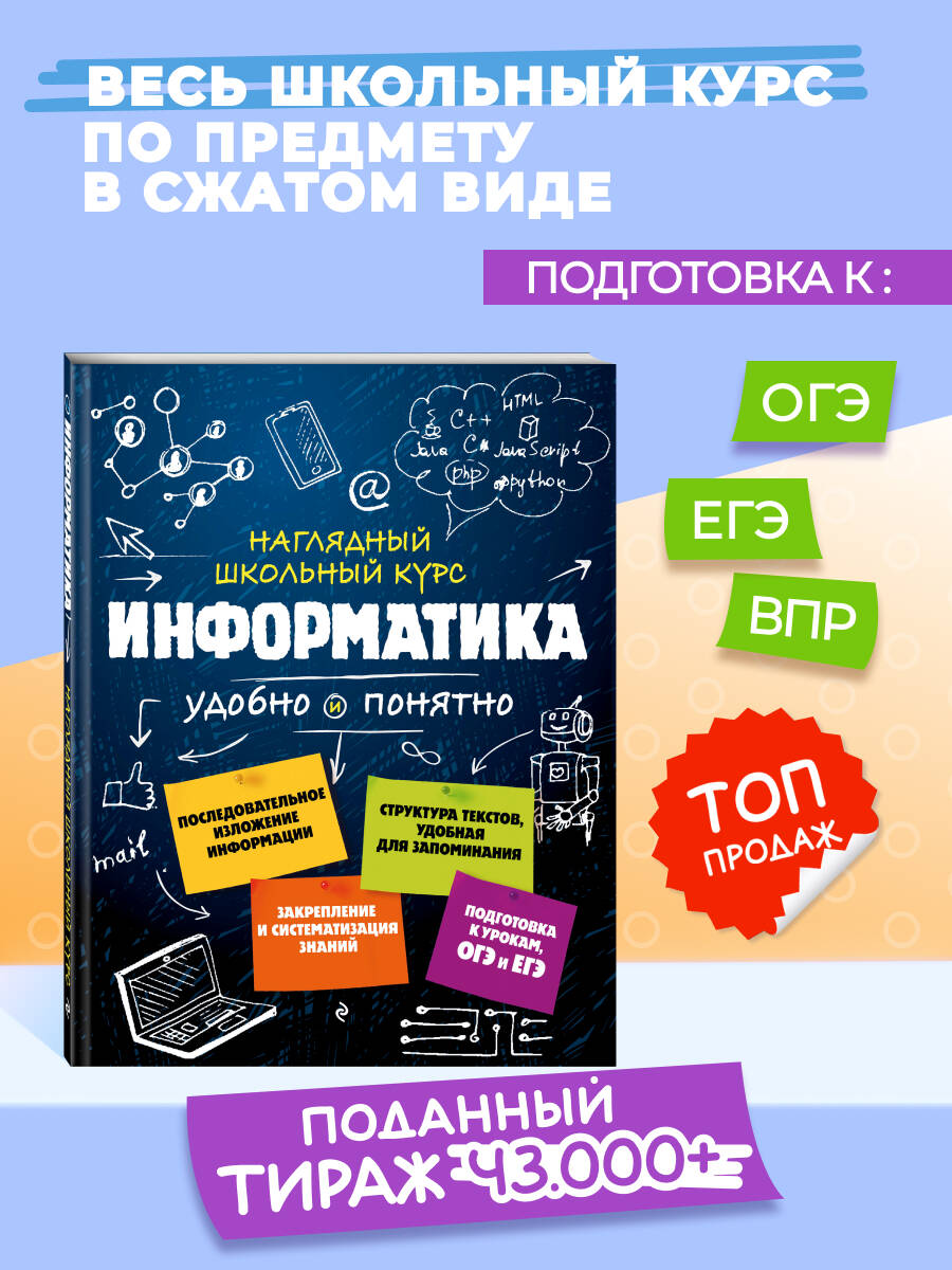 Пособие поможет быстро и эффективно подготовится к урокам, различным формам текущего и промежуточного контроля, а также к экзаменам. В книге в наглядной и доступной форме приводятся основные сведения за весь школьный курс информатики. В громоздких учебниках порой бывает сложно найти ответ на какой-то конкретный вопрос. А в данном издании представлена действительно нужная и систематизированная информация, материал изложен последовательно, от простого к сложному, дополняется иллюстрациями, примерами, наглядными схемами и таблицами. В этой книге для школьников можно найти все основные разделы предмета: «Информация и информационные процессы», «Средства информационных и коммуникационных технологий», «Алгоритмизация и программирование», «Информационная деятельность человека». Справочник обеспечит знание и понимание всех, даже самых сложных тем школьной программы. В нем каждый ученик 5-11 классов найдет много полезного для своего образования, обретет уверенность на уроках, контрольных, ОГЭ и ЕГЭ.| Издательство | ООО "Издательство "Эксмо" |