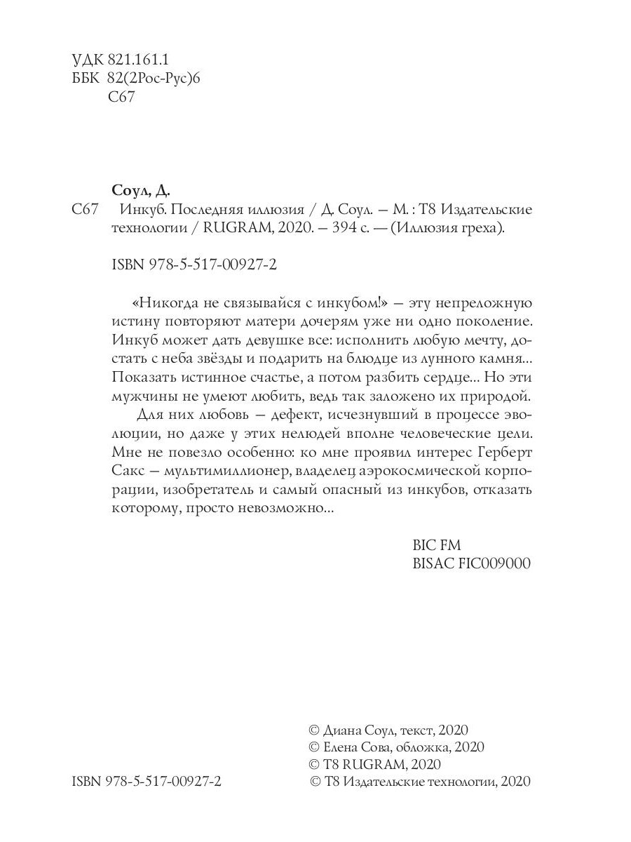 «Никогда не связывайся с инкубом!» - эту непреложную истину повторяют матери дочерям уже ни одно поколение. Инкуб может дать девушке все: исполнить любую мечту, достать с неба звёзды и подарить на блюдце из лунного камня... Показать истинное счастье, а потом разбить сердце... Но эти мужчины не умеют любить, ведь так заложено их природой. Для них любовь - дефект, исчезнувший в процессе эволюции, но даже у этих нелюдей вполне человеческие цели. Мне не повезло особенно: ко мне проявил интерес Герберт Сакс - мультимиллионер, владелец аэрокосмической корпорации, изобретатель и самый опасный из инкубов, отказать которому, просто невозможно...