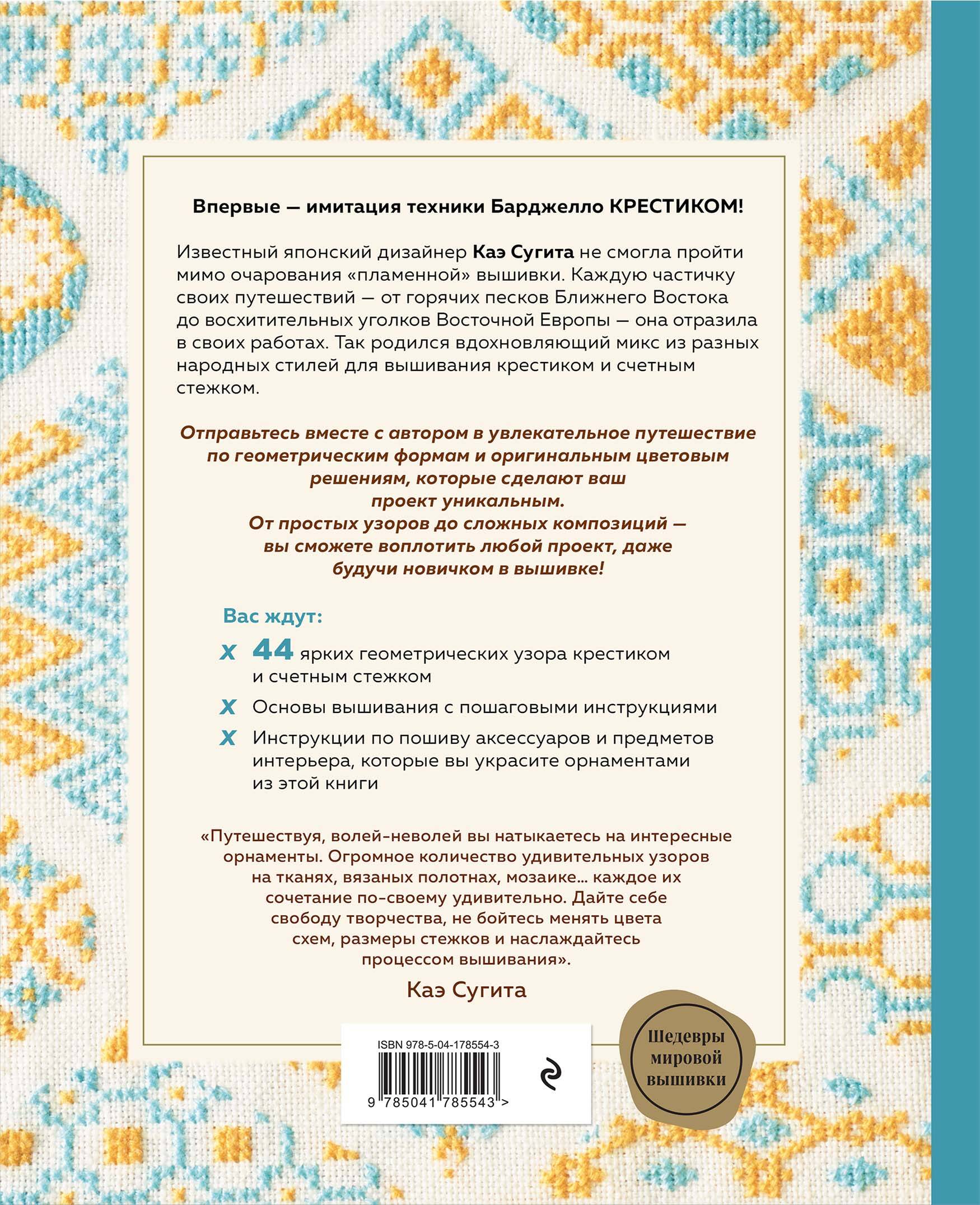 Впервые в мире - имитация техники Барджелло КРЕСТИКОМ! Эта великолепная техника вышивания имеет множество названий: «флорентийская», «венгерская» и даже «пламенная». Последнее она получила благодаря самому известному классическому узору, имитирующему пляшущие языки огня. Барджелло с первого взгляда можно отличить от любой другой техники - ее отличительными особенностями являются одинаковый размер стежков в одном ряду и градиент, создающийся перетеканием оттенков ниток из одного в другой. Известный японский дизайнер Каэ Сугита представляет уникальные дизайны для вышивания крестиком и счетным стежком, вдохновленные невероятной техникой Барджелло. Отправьтесь вместе с автором в увлекательное путешествие по геометрическим формам и оригинальным цветовым решениям, которые сделают ваш проект уникальным. От простых узоров до сложных композиций - вы сможете воплотить любой проект, даже будучи новичком в вышивке! Вас ждут: • 44 ярких геометрических узора крестиком и счетным стежком. • Основы вышивания с пошаговыми инструкциями. • Инструкции по пошиву аксессуаров и предметов интерьера, которые вы украсите орнаментами из этой книги.| Издательство | ООО "Издательство "Эксмо" |