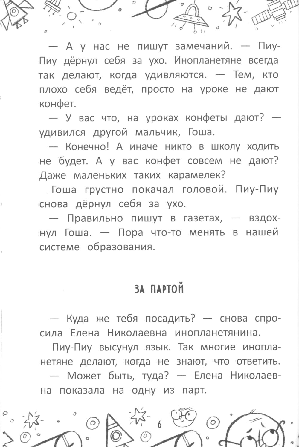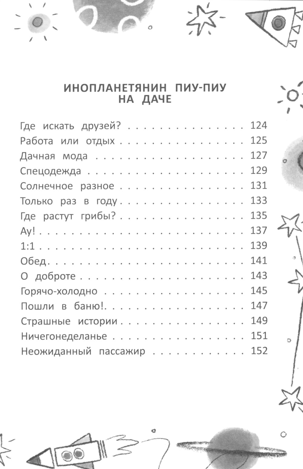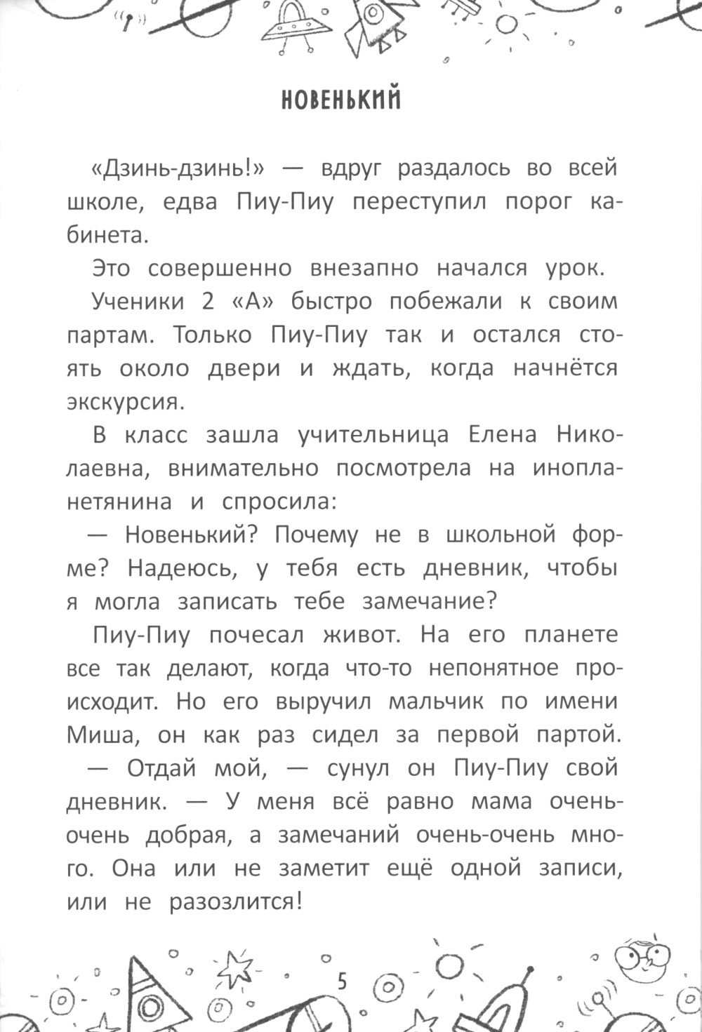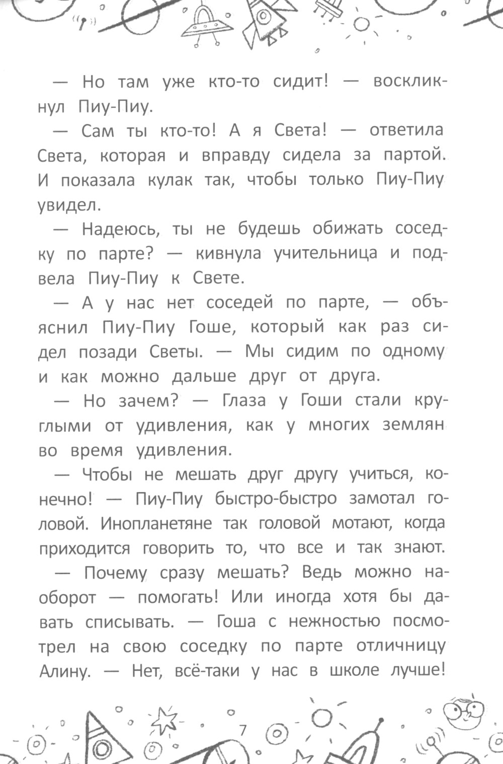 Инопланетянин Пиу-Пиу случайно приземлился в обычной школе и познакомился с учениками 2 «А». Пиу-Пиу узнал, что на планете Земля на уроках учителя не дают конфеты, за выученные стихи не хлопают в ладоши, а на переменах не принято спать. Всё совсем не так, как на родине Пиу-Пиу, но всё равно интересно! Забавные «попаданческие» истории про инопланетянина Пиу-Пиу и его земных друзей-школьников от автора Анны Черкасовой. Книга подойдёт для будущих первоклассников и для тех, кто учится в начальной школе, ведь с главным героем Пиу-Пиу ребёнок узнаёт, как устроены школы, как празднуют Новый год, во что играют во время прогулки во дворе, чем занимаются в детском летнем лагере и как проводят время на даче.| Издательство | Феникс |