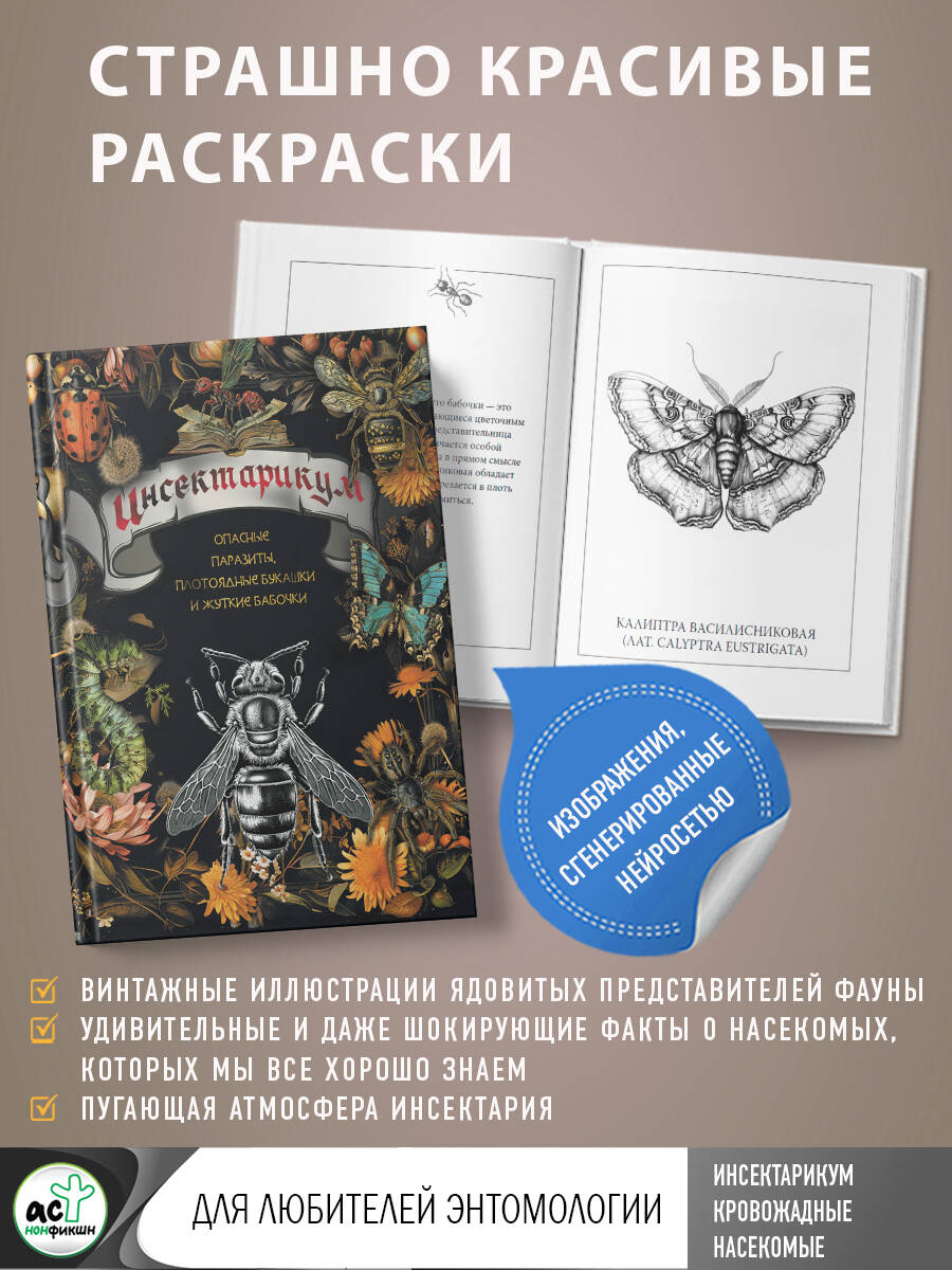 Не все букашки-таракашки безобидны. Некоторые ненароком могут даже убить… Этот кровожадный инсектарий убедит вас, что фауна коварна. Безумные. Хтонические. Прекрасные. Пролистните страницы самобытной энтомологической энциклопедии и узнайте, что скрывается за прелестными крыльями, милыми усиками и пушистыми лапками. Не дайте красоте этих насекомых себя обмануть. Откройте для себя мир зловредных созданий с новой неожиданной стороны. Внутри вас поджидают: • винтажные энтомологические иллюстрации, сгенерированные нейросетью; • удивительные и даже шокирующие факты о насекомых, со многими из которых мы живем бок о бок, даже не подозревая об опасности; • таинственная атмосфера мрачного инсектария. Вы все еще чувствуете себя в безопасности? Или уже заметили чьи-то омерзительные лапки на своем теле?| Издательство | Издательство "АСТ" |