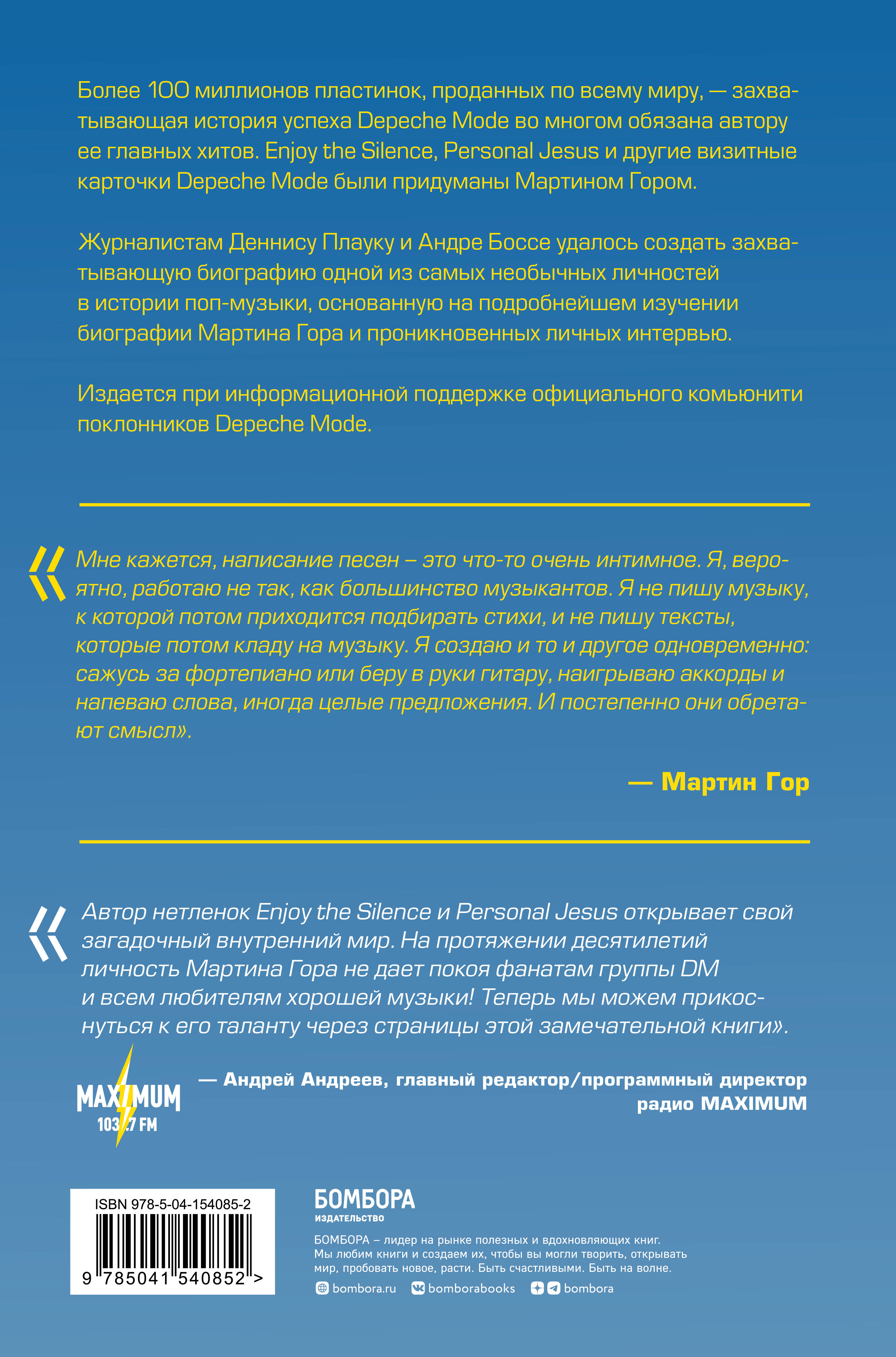 Depeche Mode - одна из самых узнаваемых и обожаемых групп в мире. Их необычный стиль вдохновляет многих современных музыкантов. Песни, ставшие визитными карточками группы, среди которых Enjoy the Silence и Personal Jesus, были придуманы ее бессменным участником Мартином Гором. «Мне кажется, написание песен - это что-то очень интимное. Я, вероятно, работаю не так, как большинство музыкантов. Я не пишу музыку, к которой потом приходится подбирать стихи, и не пишу тексты, которые потом кладу на музыку. Я создаю и то и другое одновременно: сажусь за фортепиано или беру в руки гитару, наигрываю аккорды и напеваю слова, иногда целые предложения. И постепенно они обретают смысл». - Мартин Гор Для этой книги Денис Плаук и Андре Босе провели множество подробных интервью, в том числе с самим Мартином Гором, чтобы узнать подлинную историю создания хитов и раскрыть подробности непростых взаимоотношений участников группы. «Автор нетленок Enjoy the Silence и Personal Jesus открывает свой загадочный внутренний мир. На протяжении десятилетий личность Мартина Гора не дает покоя фанатам группы DM и всем любителям хорошей музыки! Теперь мы можем прикоснуться к его таланту через страницы этой замечательной книги». - Андрей Андреев, главный редактор/программный директор радио MAXIMUM Андре Босе - журналист-фрилансер, специализируется на литературных портретах и интервью. За время работы взял интервью более чем у 100 выдающихся личностей. Сегодня он создает литературные портреты групп и музыкантов для журнала Visions и является внештатным автором в таких изданиях, как Suddeutsche Zeitung и Rolling Stone. Его история как поклонника поп-музыки берет начало в 1983 году, когда Depeche Mode и песни Мартина Гора увлекали его и сводили с ума. Деннис Плаук - главный редактор дортмундского музыкального журнала Visions, уже 20 лет обозревающего мир альтернативной рок-музыки. В процессе работы над публикациями в этих журналах он неоднократно встречался с Мартином Гором и Depeche Mode. Эти встречи еще больше укрепили его многолетнюю личную преданность группе. Книга содержит фотографии из жизни Мартина Гора и издается при информационной поддержке сообщества vk.com/club_dm| Издательство | ООО "Издательство "Эксмо" |
