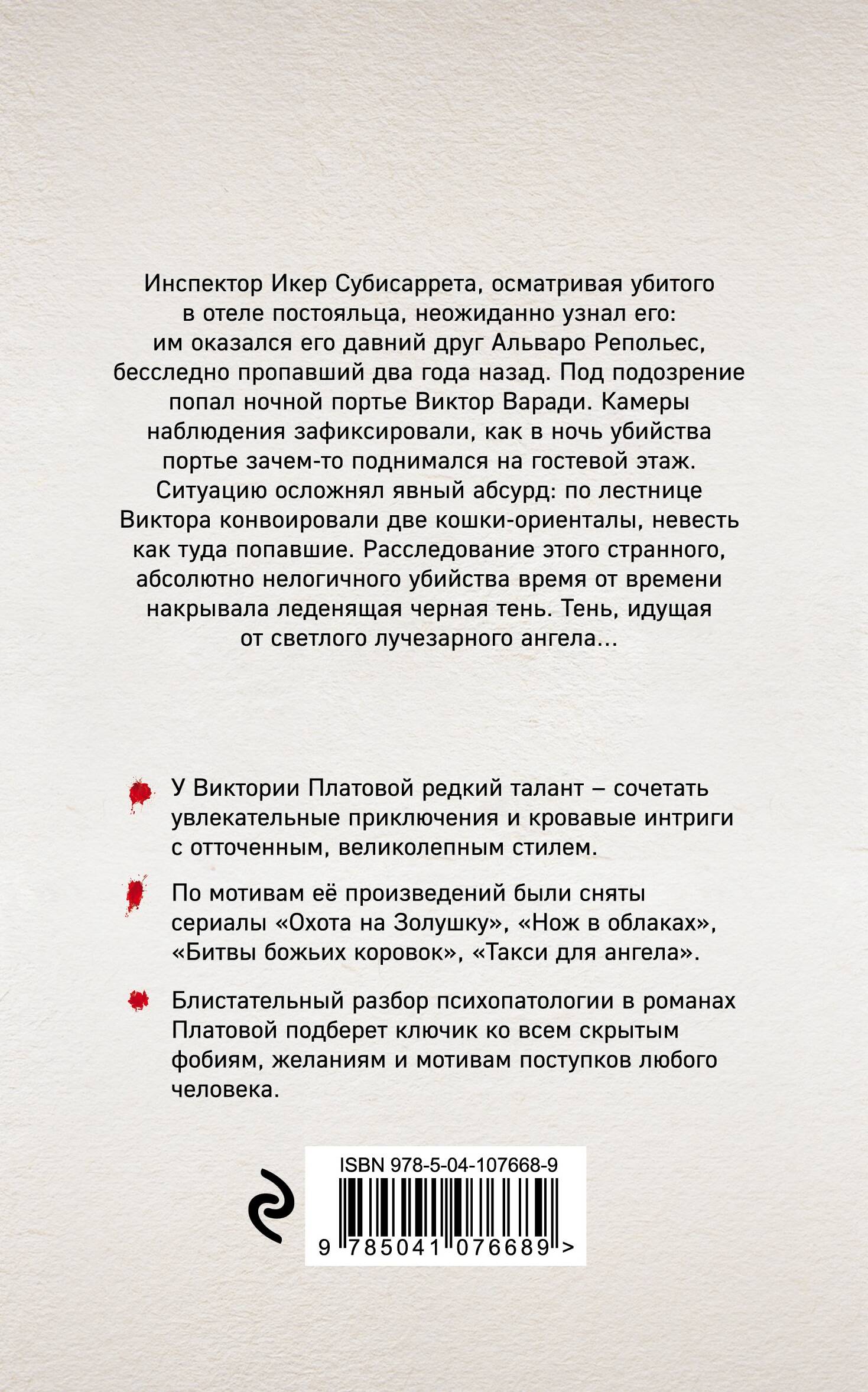 Инспектор Икер Субисаррета, осматривая убитого в отеле постояльца, неожиданно узнал его: им оказался его давний друг Альваро Репольес, бесследно пропавший два года назад. Под подозрение попал ночной портье Виктор Варади. Камеры наблюдения зафиксировали, как в ночь убийства портье зачем-то поднимался на гостевой этаж. Ситуацию осложнял явный абсурд: по лестнице Виктора конвоировали две кошки-ориенталы, невесть как туда попавшие. Расследование этого странного, абсолютно нелогичного убийства время от времени накрывала леденящая черная тень. Тень, идущая от светлого лучезарного ангела… • Виктория Платова - единственный российский автор, работающий в жанре мистического реализма. Чтобы познать себя, не обязательно штудировать учебники по психологии. Блистательный разбор психопатологии в романах Платовой подберет ключик ко всем скрытым фобиям, желаниям и мотивам поступков любого человека. • Произведения Виктории Платовой завоевали популярность не только среди русскоязычных читателей: книги переведены на многие языки, и фамилия писательницы знакома любителям детективного жанра в европейских странах и даже за океаном. Особенной популярностью до сих пор пользуется первая книга Платовой, а также романы «Купель дьявола», «Геометрия убийства», «Инспектор и бабочка», «Stalingrad, станция метро». • У Виктории Платовой редкий талант - сочетать увлекательные приключения и кровавые интриги с отточенным, великолепным стилем. • Виктория Платова удивила читателей и поклонников, написав стихи для композиций украинской певицы Джамалы. Песни «Кактус» и «Я люблю тебя» принадлежат перу писательницы.| Издательство | ООО "Издательство "Эксмо" |
