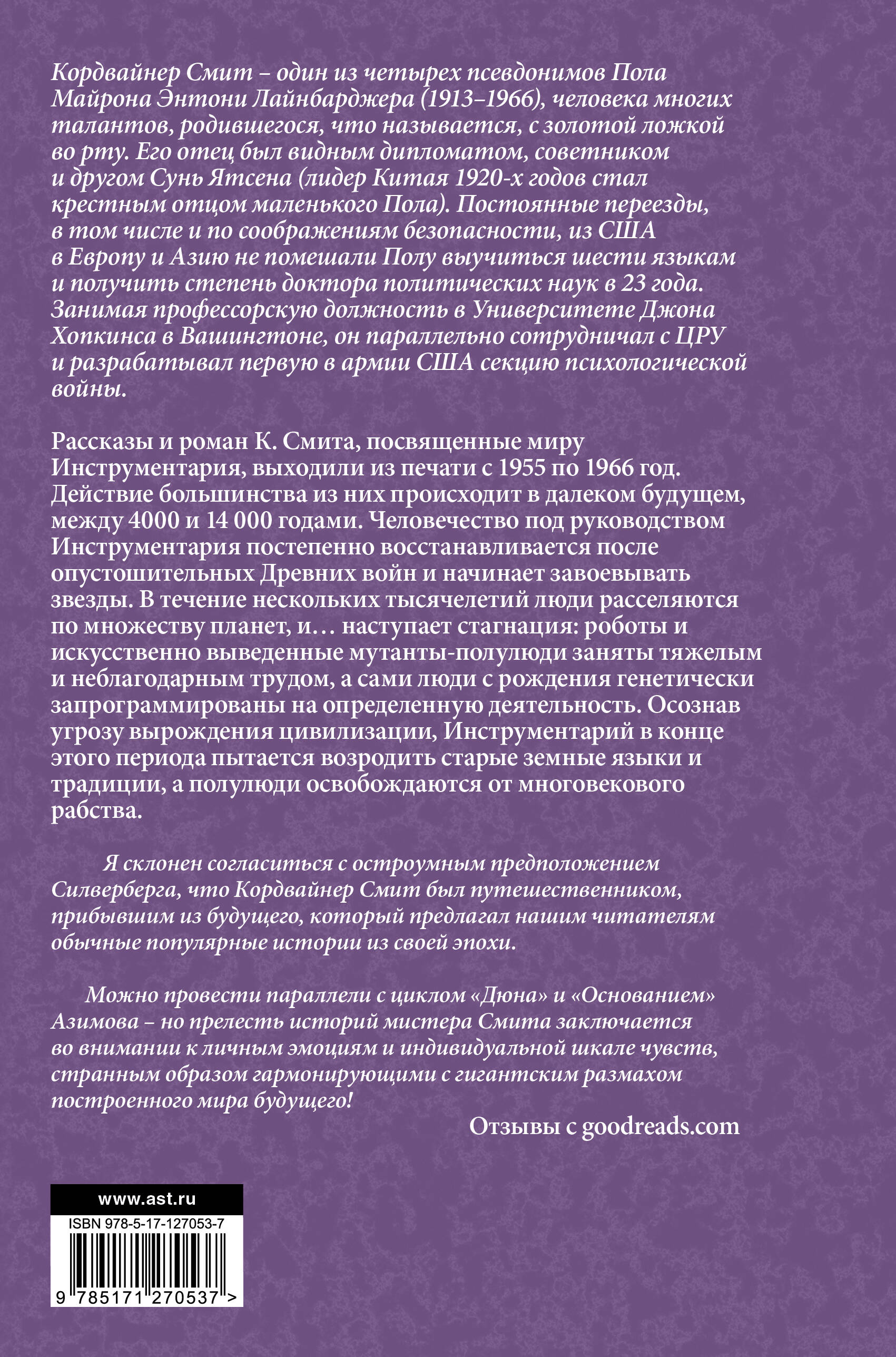 Кордвайнер Смит - один из четырех псевдонимов Пола Майрона Энтони Лайнбарджера (1913 - 1966), человека многих талантов, родившегося, что называется, с золотой ложкой во рту. Его отец был видным дипломатом, советником и другом Сунь Ятсена (лидер Китая 1920-х годов стал крестным отцом маленького Пола). Постоянные переезды, в том числе и по соображениям безопасности, из США в Европу и Азию не помешали Полу выучиться шести языкам и получить степень доктора политических наук в 23 года. Занимая профессорскую должность в Университете Джона Хопкинса в Вашингтоне, он параллельно сотрудничал с ЦРУ и разрабатывал первую в армии США секцию психологической войны. Рассказы и роман К. Смита, посвященные миру Инструментария, выходили из печати с 1955 по 1966 год. Действие большинства из них происходит в далеком будущем, между 4000 и 14000 годами. Человечество под руководством Инструментария постепенно восстанавливается после опустошительных Древних войн и начинает завоевывать звезды. В течение нескольких тысячелетий люди расселяются по множеству планет, и… наступает стагнация: роботы и искусственно выведенные мутанты - полулюди заняты тяжелым и неблагодарным трудом, а сами люди с рождения генетически запрограммированы на определенную деятельность. Осознав угрозу вырождения цивилизации, Инструментарий в конце этого периода пытается возродить старые земные языки и традиции, а полулюди освобождаются от многовекового рабства.