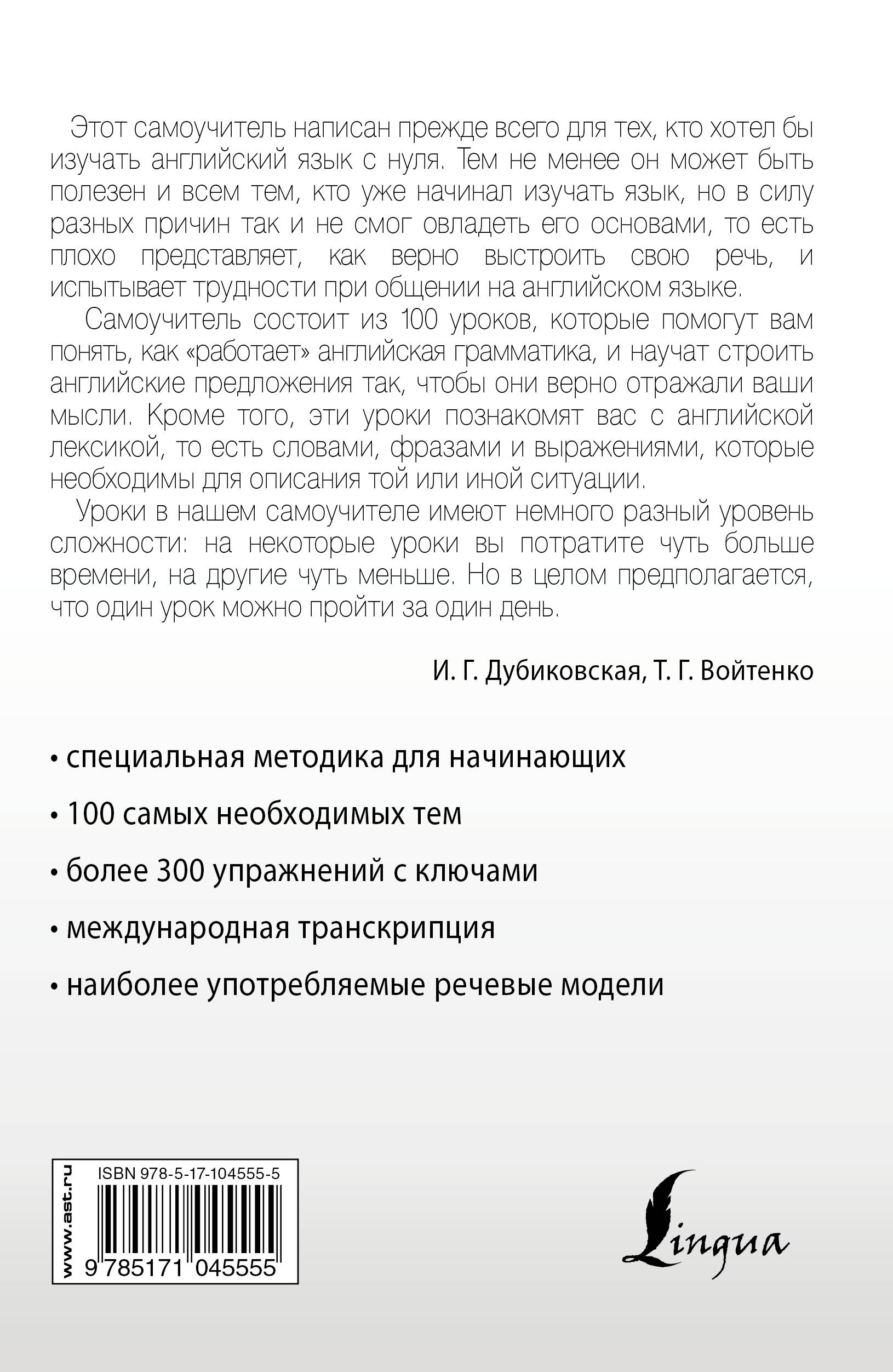 Данное учебное пособие содержит лексический и грамматический материал для изучения английского языка с нулевого уровня до уровня pre-intermediate (A2/B1). Курс разбит на 100 относительно небольших, но насыщенных уроков и рассчитан на прохождение в течение 100 дней, то есть на освоение 1 урока потребуется 1 день. Для отработки языковых навыков и речевых умений предлагается большое количество упражнений, ключи к которым расположены в конце книги. Пособие также научит вас работать с текстами на английском языке и сообщит базовые сведения о культуре современного англоязычного мира. Книга адресован всем, кто хочет овладеть английским языком, не слишком затягивая процесс изучения, и готов к интенсивным самостоятельным занятиям.| Издательство | ИЗДАТЕЛЬСТВО "АСТ" |