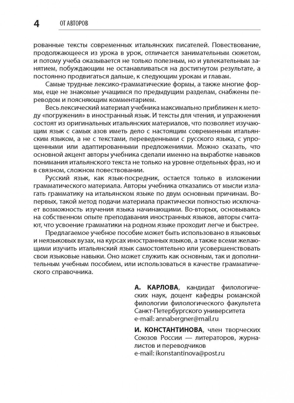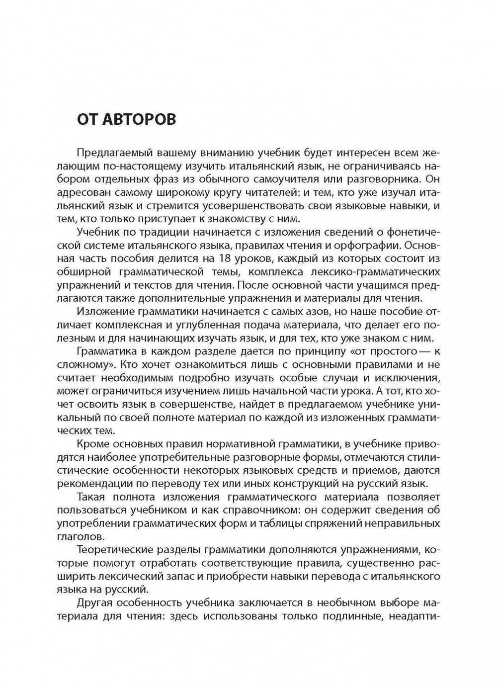 Предлагаемое учебное пособие адресовано тем, кто только начал изучать итальянский язык, и тем, кто его уже изучал, но хочет усовершенствовать свои языковые навыки. Комплексное и углубленное изложение грамматического материала в сочетании с соответствующими упражнениями дополнено оригинальными текстами современных итальянских авторов, снабженными комментариями наиболее трудных лексико-грамматических форм. Учебник предназначен для студентов первого курса филологического факультета, а также для студентов языковых и неязыковых вузов, изучающих итальянский язык. Он может использоваться в качестве дополнительной литературы на курсах иностранных языков и как справочное пособие по грамматике.