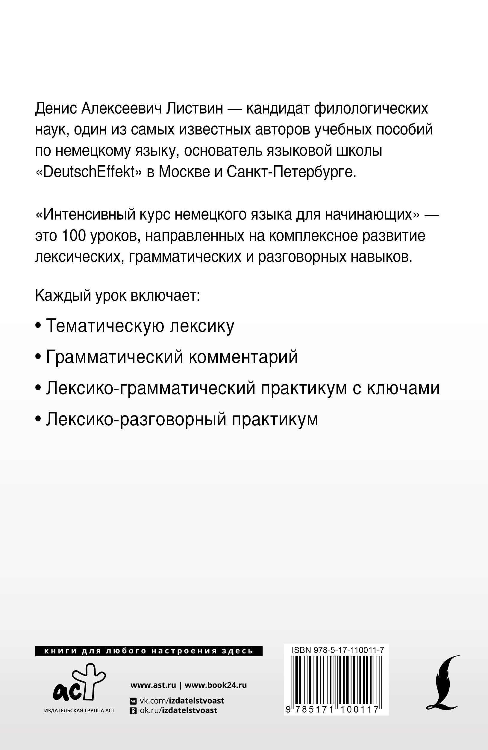 В серию «Иностранный за 100 дней» входят пособия для изучения иностранных языков, построенные по принципу «1 день - 1 урок», что позволяет осваивать материал быстро и эффективно. «Интенсивный курс немецкого языка для начинающих» - это 100 уроков, направленных на комплексное развитие лексических, грамматических и разговорных навыков. - специальная методика для начинающих - самые необходимые грамматические темы - большое количество упражнений с ключами