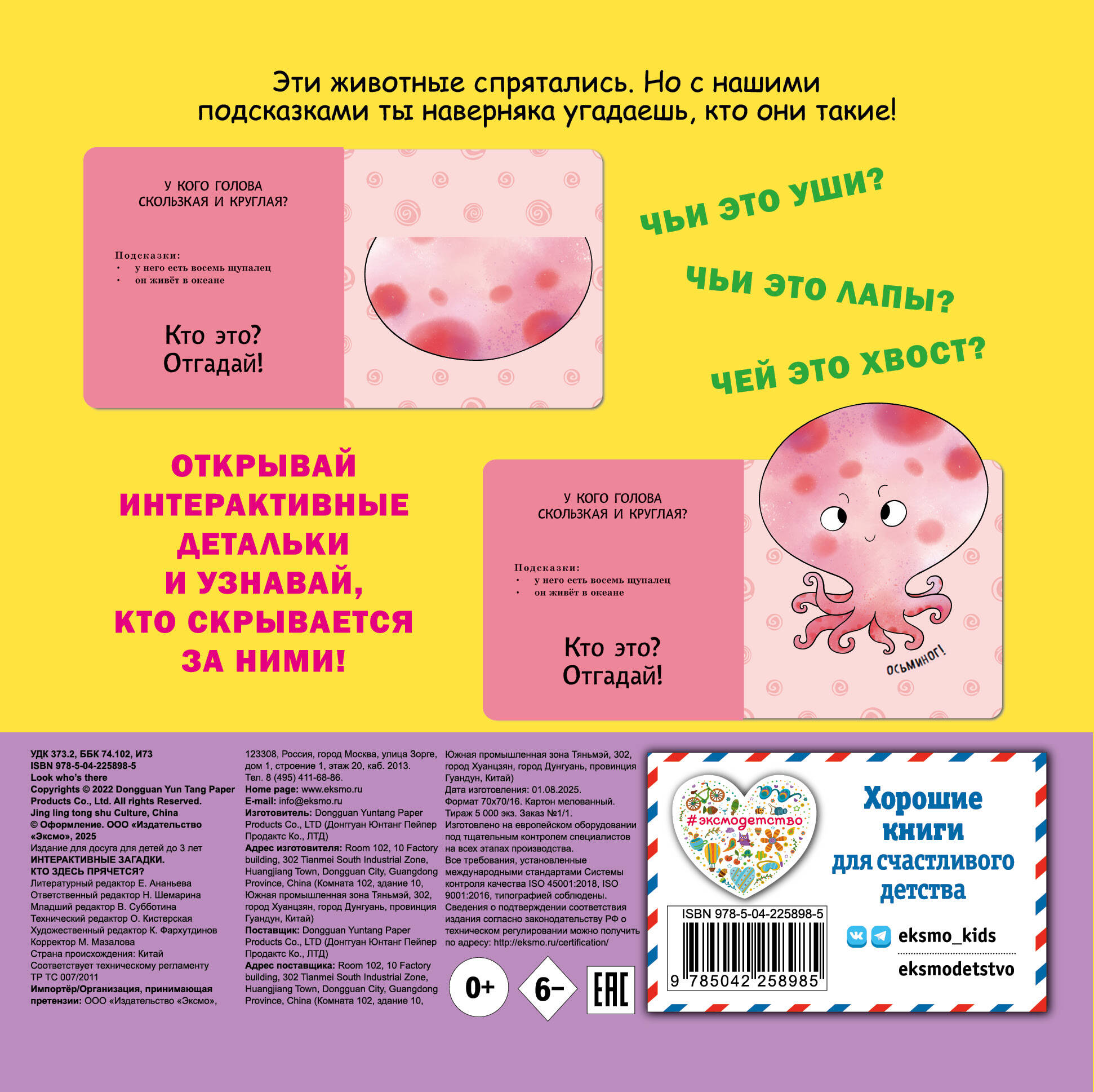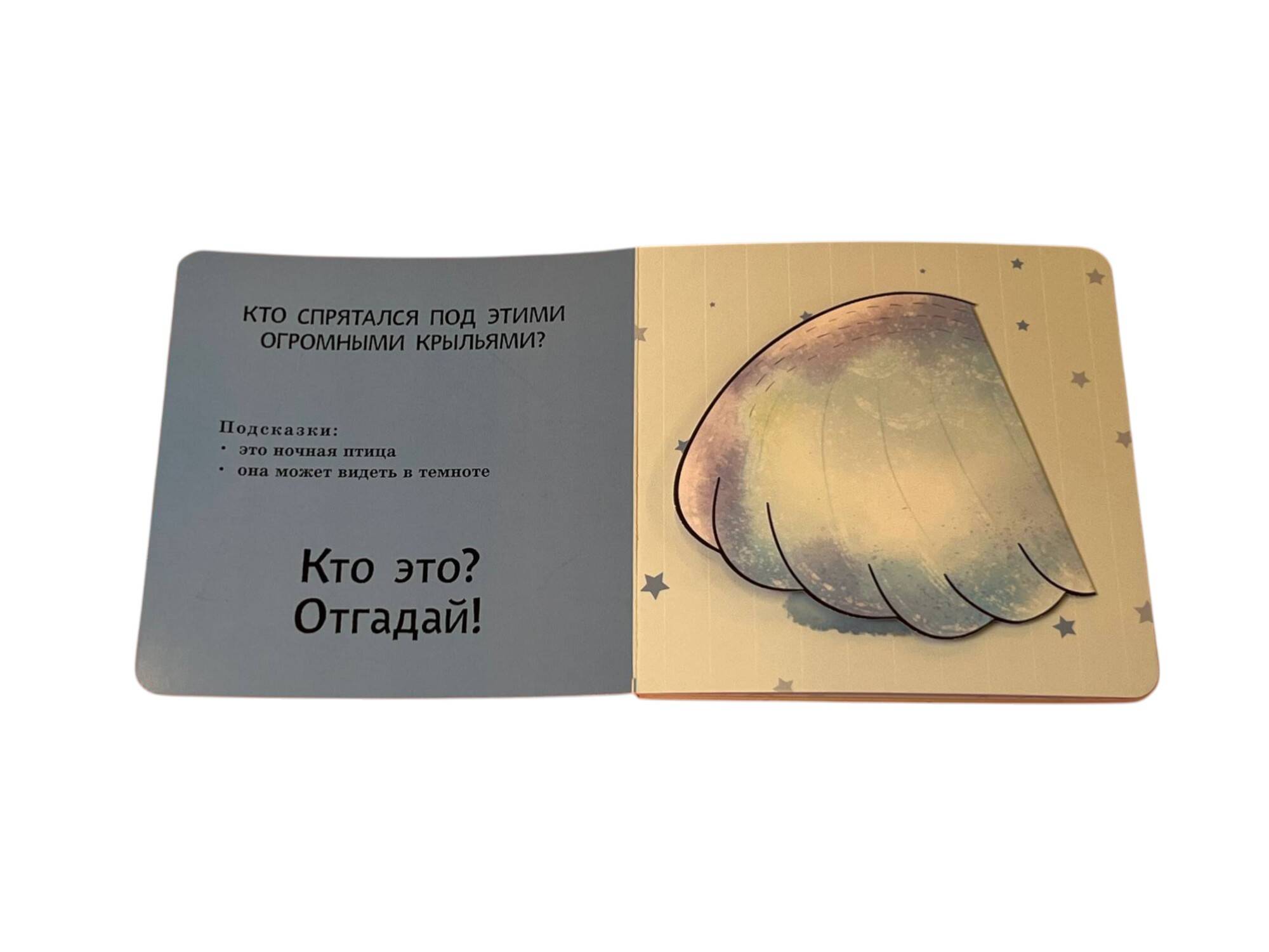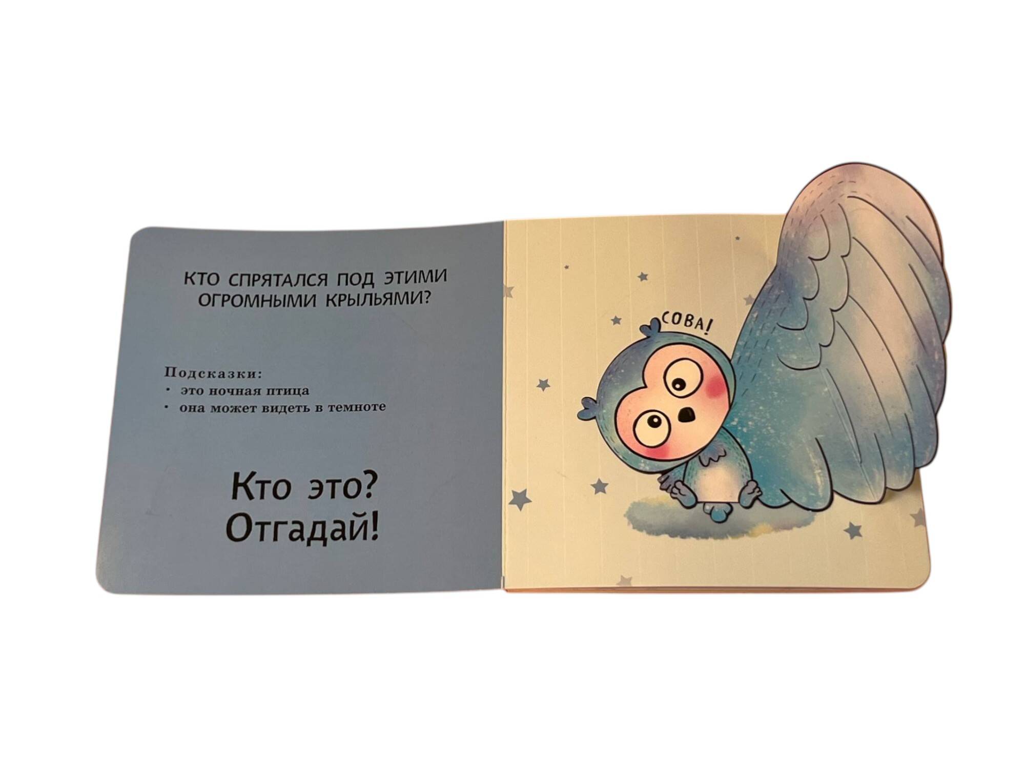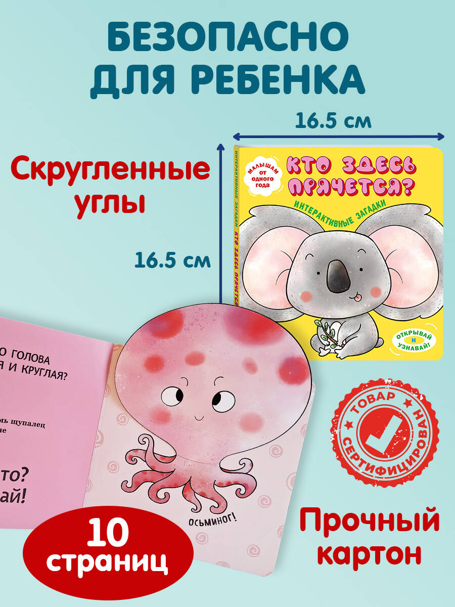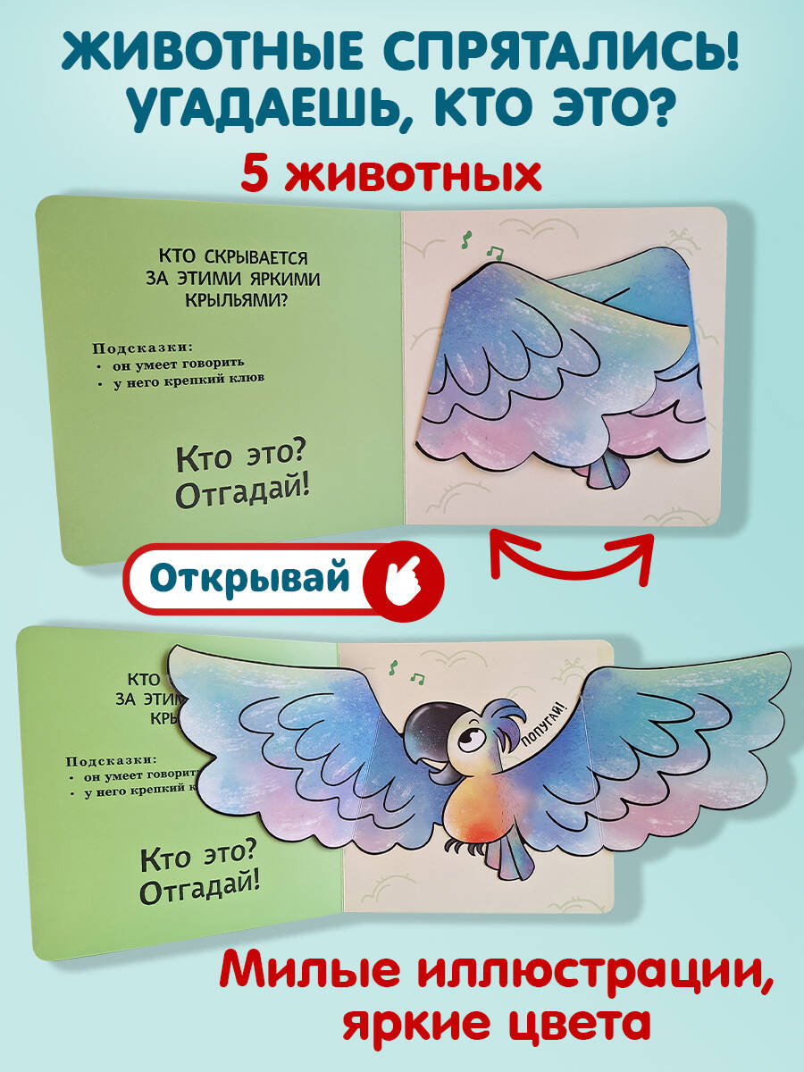 Интерактивная книга-загадка для малышей! Загляните под объёмные элементы - крылья, ушки или лапки - и познакомьтесь с обитателями животного мира! Эта красочно оформленная книжка-картинка превращает чтение в увлекательную игру: малыш может сам открыть створку, чтобы узнать верный ответ на загадку и увидеть, кто же прячется на страничке. А это… сова, коала, осьминог и другие интересные животные! Путешествуя по страницам книги вместе с милыми персонажами, малыш познакомится с разными животными, пополнит словарный запас и расширит кругозор. Красочные и детализированные иллюстрации очаруют и ребёнка, и взрослого. Издание прослужит малышу долгое время: твёрдая обложка, скруглённые углы, толстые картонные страницы с матовым лакированием, которые удобно переворачивать маленькими ручками. Только безопасные материалы! Эта развивающая книга отлично подходит детям до 3 лет. А игра с интерактивными элементами поможет развить мелкую моторику, воображение и память.| Издательство | ООО "Издательство "Эксмо" |