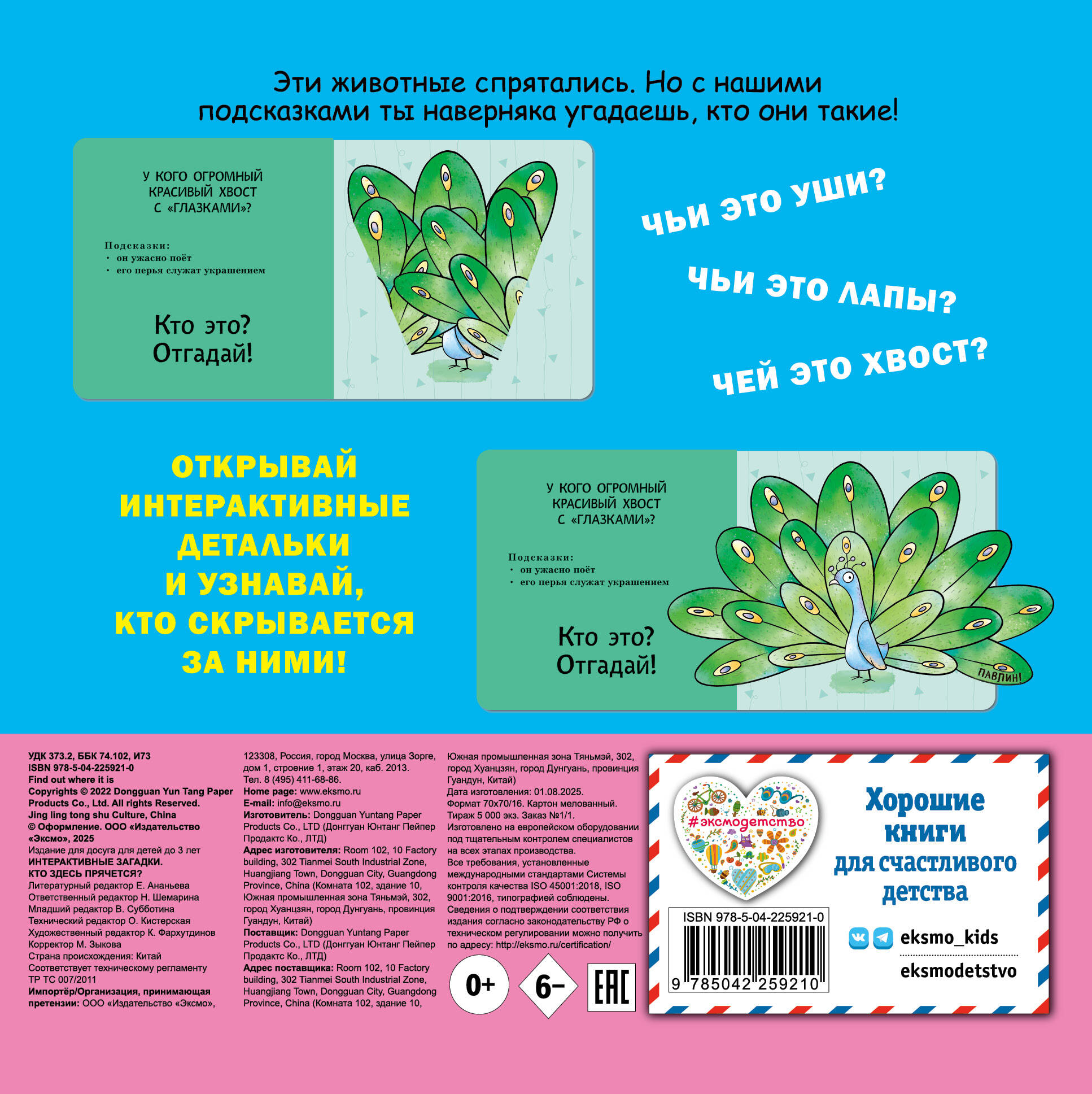 Интерактивная книга-загадка для малышей! Загляните под объёмные элементы - крылья, ушки или лапки - и познакомьтесь с обитателями животного мира! Эта красочно оформленная книжка-картинка превращает чтение в увлекательную игру: малыш может сам открыть створку, чтобы узнать верный ответ на загадку и увидеть, кто же прячется на страничке. А это… ленивец, павлин, летучая мышь и другие интересные животные! Путешествуя по страницам книги вместе с милыми персонажами, малыш познакомится с разными животными, пополнит словарный запас и расширит кругозор. Красочные и детализированные иллюстрации очаруют и ребёнка, и взрослого. Издание прослужит малышу долгое время: твёрдая обложка, скруглённые углы, толстые картонные страницы с матовым лакированием, которые удобно переворачивать маленькими ручками. Только безопасные материалы! Эта развивающая книга отлично подходит детям до 3-х лет. А игра с интерактивными элементами поможет развить мелкую моторику, воображение и память.| Издательство | ООО "Издательство "Эксмо" |