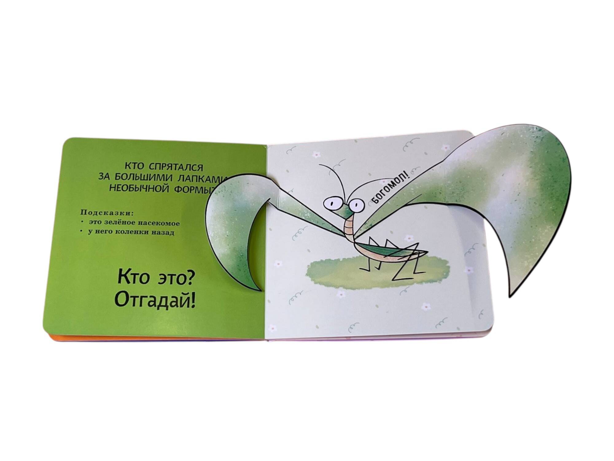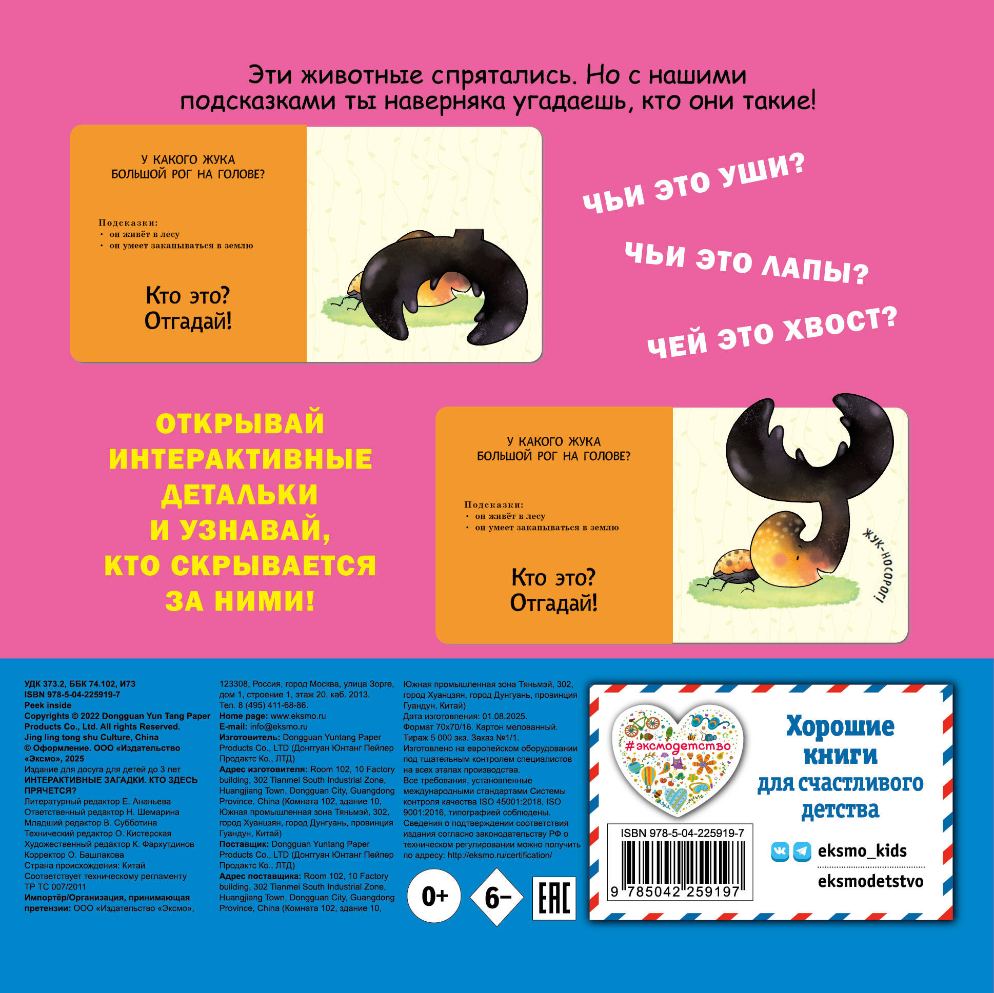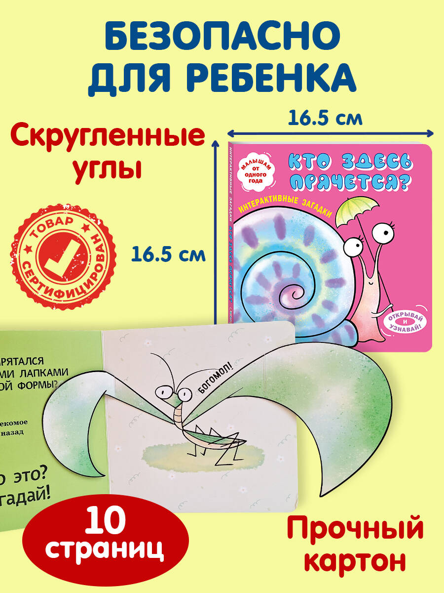 Интерактивная книга-загадка для малышей! Загляните под объёмные элементы - крылья, ушки или лапки - и познакомьтесь с обитателями животного мира! Эта красочно оформленная книжка-картинка превращает чтение в увлекательную игру: малыш может сам открыть створку, чтобы узнать верный ответ на загадку и увидеть, кто же прячется на страничке. А это… пчёлка, улитка, бабочка и другие интересные животные! Путешествуя по страницам книги вместе с милыми персонажами, малыш познакомится с разными животными, пополнит словарный запас и расширит кругозор. Красочные и детализированные иллюстрации очаруют и ребёнка, и взрослого. Издание прослужит малышу долгое время: твёрдая обложка, скруглённые углы, толстые картонные страницы с матовым лакированием, которые удобно переворачивать маленькими ручками. Только безопасные материалы! Эта развивающая книга отлично подходит детям до 3-х лет. А игра с интерактивными элементами поможет развить мелкую моторику, воображение и память.| Издательство | ООО "Издательство "Эксмо" |