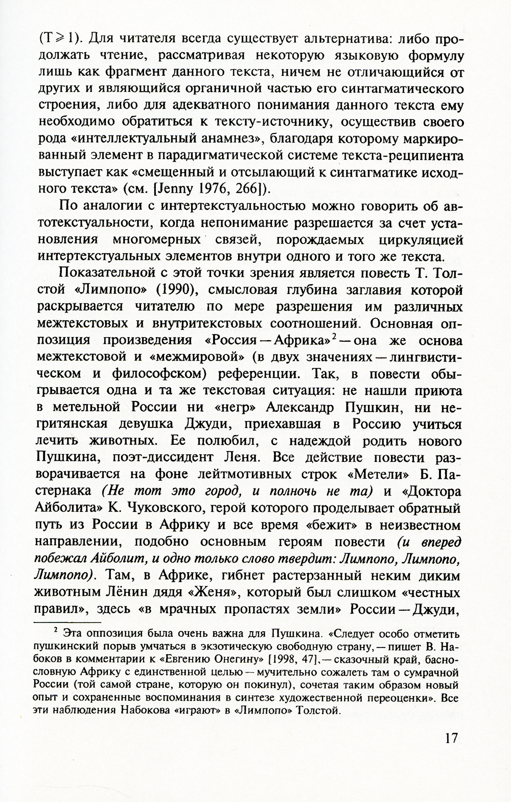 В настоящей монографии, посвященной исследованию интертекста, с одной стороны, представлено обобщение имеющихся данных по этому вопросу, а с другой - предлагается собственная авторская теория процесса интертекстуализации. В книге дается суммирующее определение понятия интертекстуальности, вводятся формальные единицы интертекстуального анализа, опирающиеся на понятия «памяти слова» и «памяти текста». Определяются функции межтекстовых отношений в художественном тексте и выделяются их основные типы. В работе также рассматривается проблема идиостилевых влияний: «Пастернак и Пушкин», «Пастернак и Достоевский», «Белый и Пушкин», «Белый и Мандельштам», «Набоков и Пушкин», «Набоков и Достоевский», в связи с чем с точки зрения межтекстовых связей изучаются наиболее выдающиеся произведения русской литературы XX века, такие как «Петербург» А. Белого, «Египетская марка» О. Мандельштама, «Дар» и «Отчаяние» В. Набокова, «Доктор Живаго» Б. Пастернака. Книга будет полезна как специалистам в области языкознания, литературоведения, культурологии, так и всем интересующимся литературой Серебряного века.| Издательство | ЛЕНАНД |