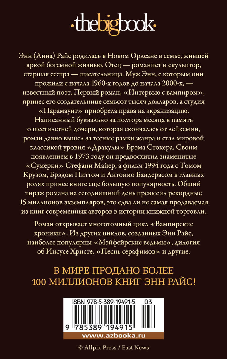 Драматическая история вампира, пересказывающего свою жизнь по эту и по ту сторону бытия, - французские колонии в Луизиане, Париж XIX века, глухая деревушка в Карпатах… Обитатели мира тьмы, это воплощенное зло, - неужели они, как люди, способны страдать и| Издательство | Азбука-Аттикус Издат.группа ООО |