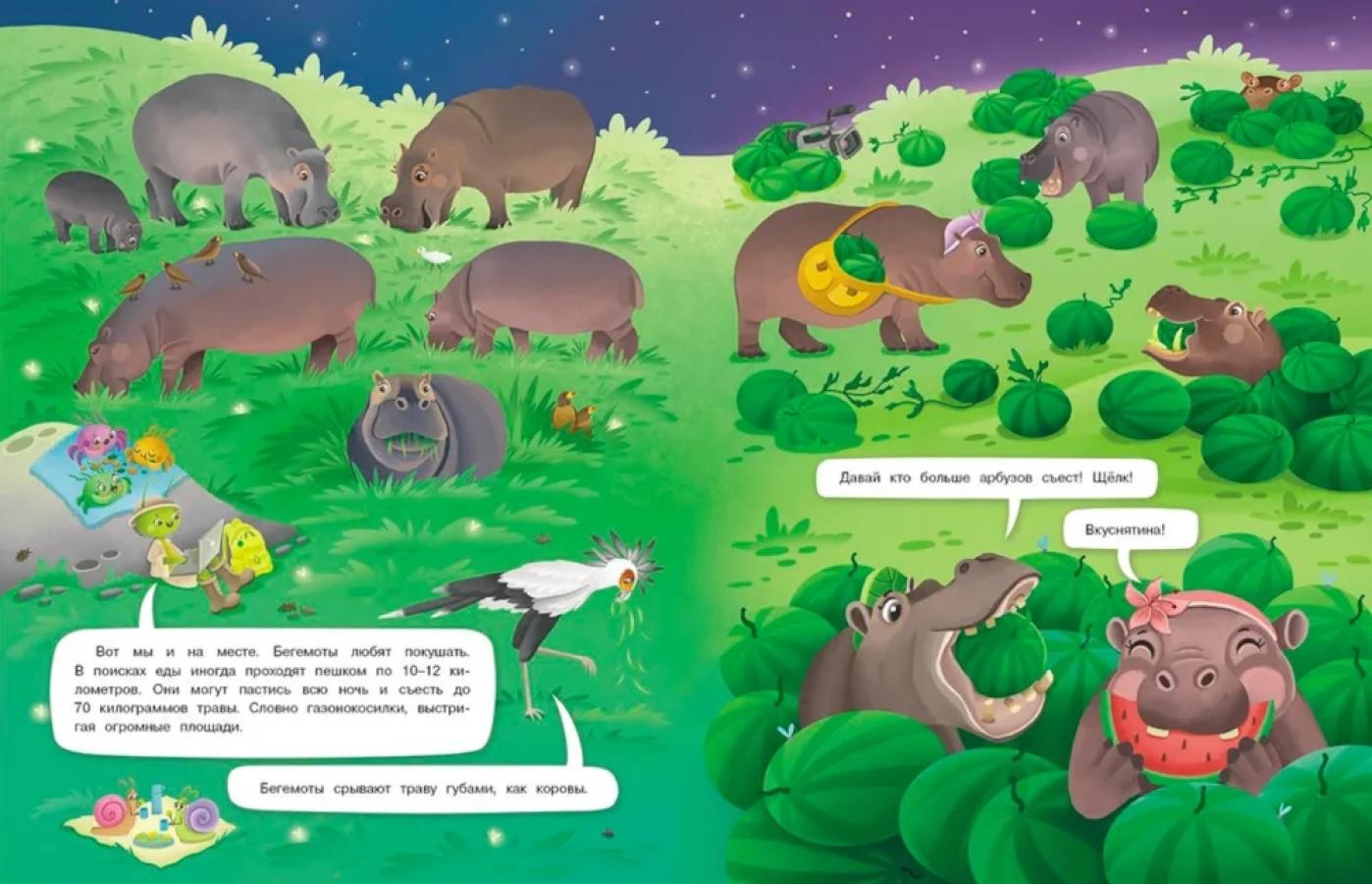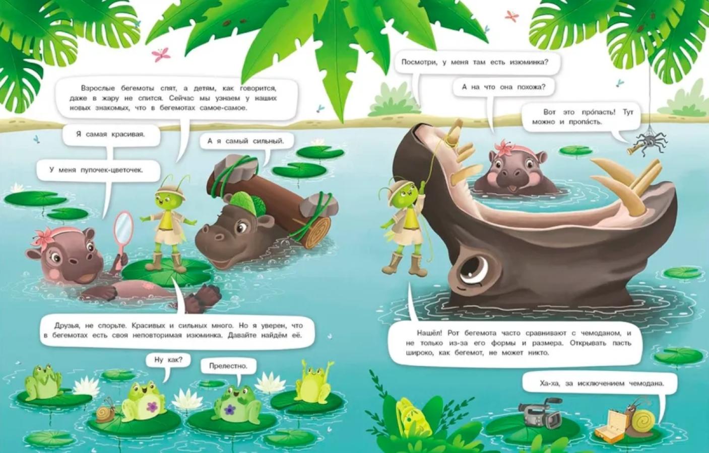 Всем привет! В эфире телеканал «Интервью вприпрыжку»! И с вами я - неповторимый, неутомимый, самый известный в мире животных кузнечик - репортёр Пружинка. Со мной, как всегда, волшебный рюкзачок, в котором я найду всё, что мне потребуется в нужную минуту. Сегодня я отправляюсь... ...Я отправляюсь в Африку - самый жаркий материк нашей планеты! Сенсация! Кузнечику Пружинке посчастливилось взять интервью у бегемотов! Ему удалось найти изюминку в огромной пасти бегемота и посетить подводный бегемотовый спа-салон. Вместе с пружинкой вы разберетесь, кто ближе к бегемотам: свиньи или киты. Раскроете тайну, почему бегемоты на солнце становятся розовыми. Узнаете, когда бегемоты зевают и как воспитывают малышей. А в заключение вас ждет ночной забег на бегемотах! Не пропустите, будет много интересного!| Издательство | Стрекоза |
