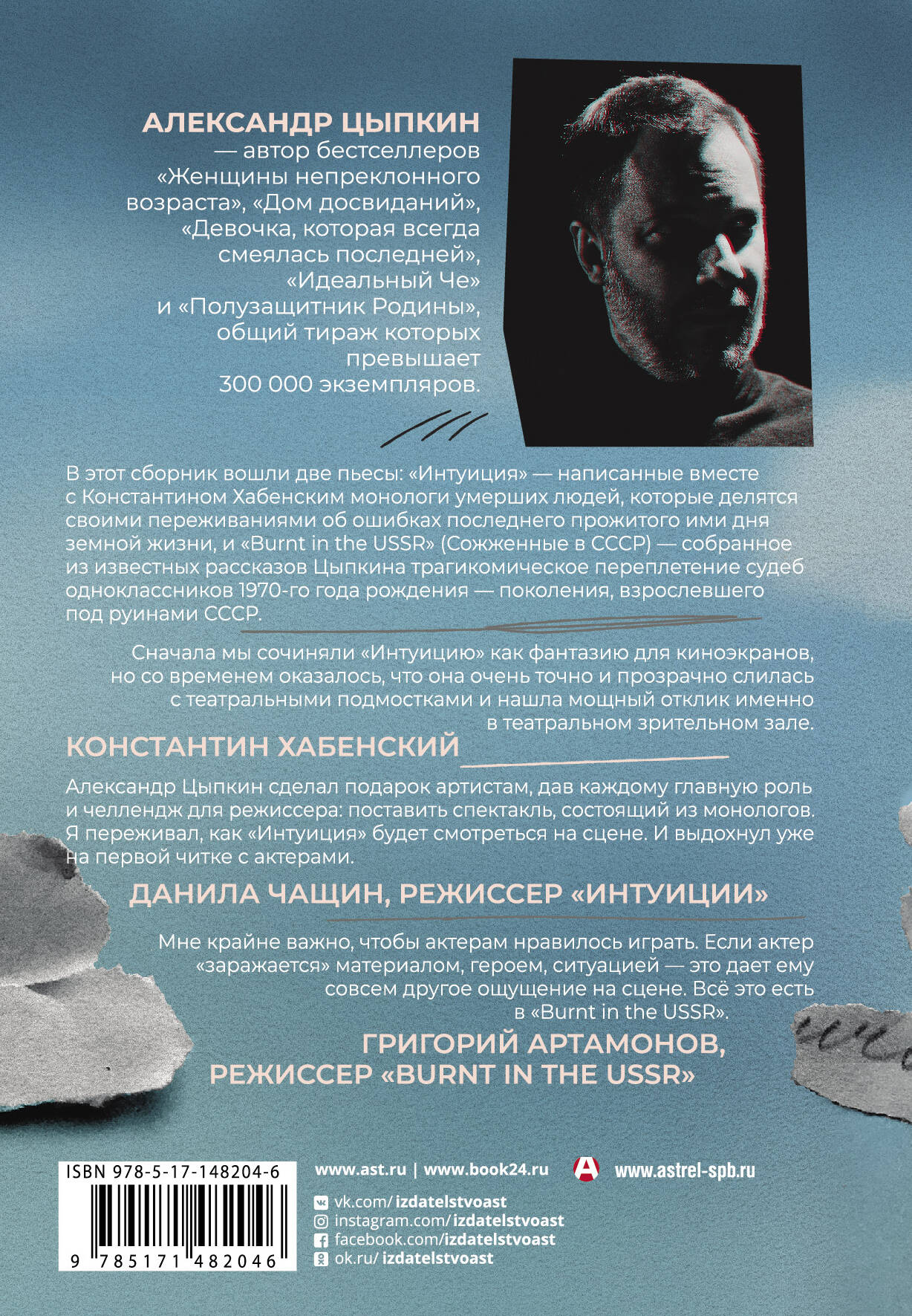 Сначала мы сочиняли "Интуицию" как фантазию для киноэкранов, но со временем оказалось, что она очень точно и прозрачно слилась с театральными подмостками и нашла мощный отклик именно в театральном зрительном зале. Константин Хабенский Александр Цыпкин сделал подарок артистам, дав каждому главную роль и челлендж для режиссера: поставить спектакль, состоящий из монологов. Я переживал, как "Интуиция" будет смотреться на сцене. И выдохнул уже на первой читке с актерами. Данила Чащин, режиссер "Интуиции" Мне крайне важно, чтобы актерам нравилось играть. Если актер "заражается" материалом, героем, ситуацией - это дает ему совсем другое ощущение на сцене. Всё это есть в "Burnt in the USSR". Григорий Артамонов, режиссер "Burnt in the USSR" Истории Александра Цыпкина - автора «БеспринцЫпных чтений» и одного из самых популярных писателей в России - по всему миру читают лучшие российские актеры, и теперь эти истории ожидаемо стали превращаться в спектакли. «Три товарища? О чем молчит балет» - в репертуаре «Приюта комедианта». «Burnt in the USSR» играют на малой сцене «Гоголь-центра». «Интуиция» идет в Театре драмы имени Шукшина, и вот теперь эту пьесу ставят в московском «Современнике». «Идеальный Че» репетируют в театре имени Ермоловой. В этот сборник вошли две пьесы: «Интуиция» - написанные вместе с Константином Хабенским монологи умерших людей, которые делятся своими переживаниями об ошибках последнего прожитого ими дня земной жизни, и «Burnt in the USSR» (Сожженные в СССР) - собранное из известных рассказов Цыпкина трагикомическое переплетение судеб одноклассников 1970-го года рождения - поколения, взрослевшего под руинами СССР.