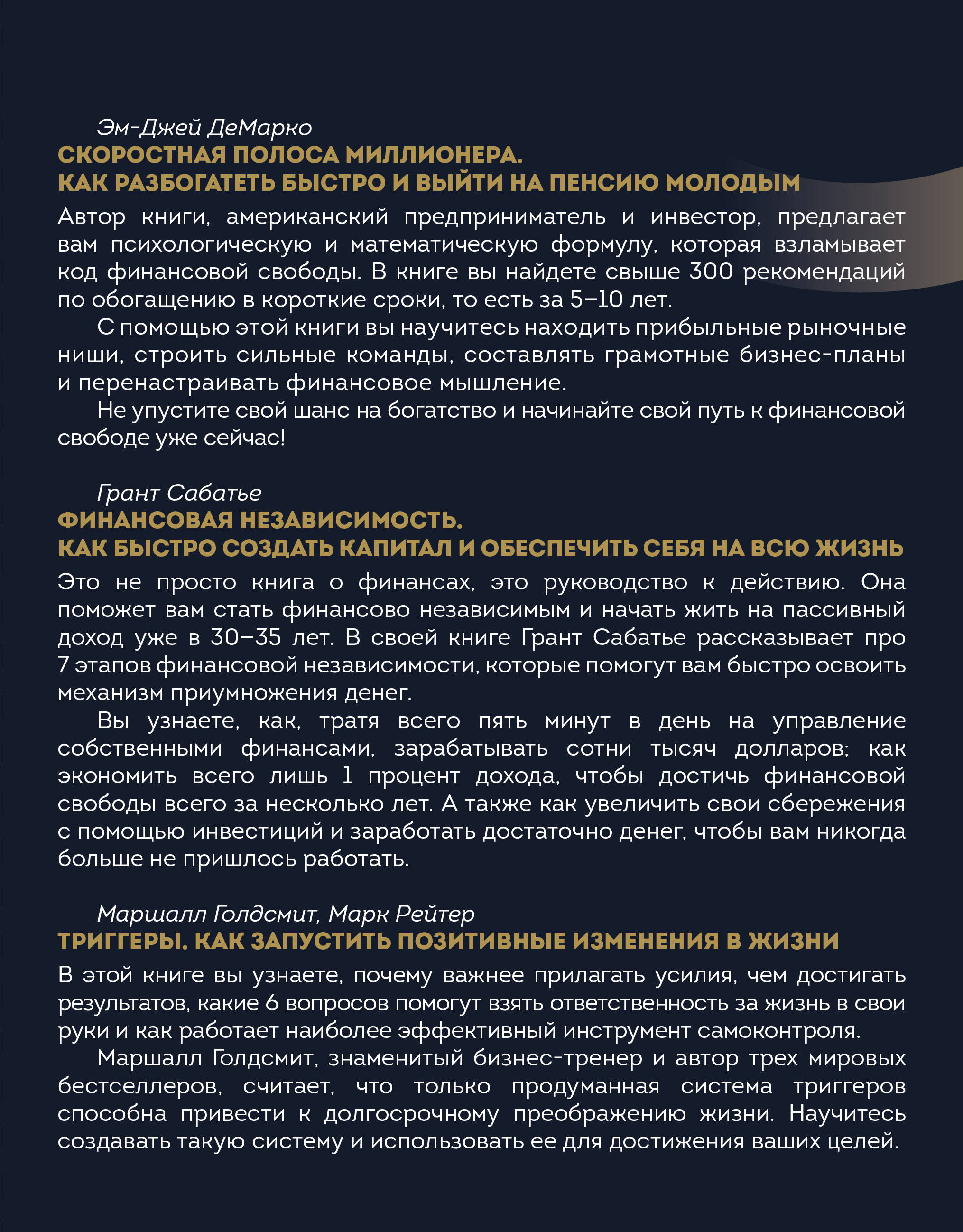3 книги для того, кто мечтает о финансовой свободе. Эм-Джей ДеМарко. «Скоростная полоса миллионера. Как разбогатеть быстро и выйти на пенсию молодым» Автор книги, американский предприниматель и инвестор, предлагает вам психологическую и математическую формулу, которая взламывает код финансовой свободы. В книге вы найдете свыше 300 рекомендаций по обогащению в короткие сроки, то есть за 5-10 лет. С помощью этой книги вы научитесь находить прибыльные рыночные ниши, строить сильные команды, составлять грамотные бизнес-планы и перенастраивать финансовое мышление. Грант Сабатье. «Финансовая независимость. Как быстро создать капитал и обеспечить себя на всю жизнь» Это не просто книга о финансах, это руководство к действию. Она поможет вам стать финансово независимым и начать жить на пассивный доход уже в 30-35 лет. В своей книге Грант Сабатье рассказывает про 7 этапов финансовой независимости, которые помогут вам быстро освоить механизм преумножения денег. Вы узнаете, как, тратя всего пять минут в день на управление собственными финансами, зарабатывать сотни тысяч долларов, а также как увеличить свои сбережения с помощью инвестиций и заработать достаточно денег, чтобы вам никогда больше не пришлось работать. Маршалл Голдсмит, Марк Рейтер. «Триггеры. Как запустить позитивные изменения в жизни» В этой книге вы узнаете, почему важнее прилагать усилия, чем достигать результатов, какие 6 вопросов помогут взять ответственность за жизнь в свои руки и как работает наиболее эффективный инструмент самоконтроля. Маршалл Голдсмит, знаменитый бизнес-тренер и автор трех мировых бестселлеров, считает, что только продуманная система триггеров способна привести к долгосрочному преображению жизни. Научитесь создавать такую систему и использовать ее для достижения ваших целей.| Издательство | ООО "Издательство "Эксмо" |