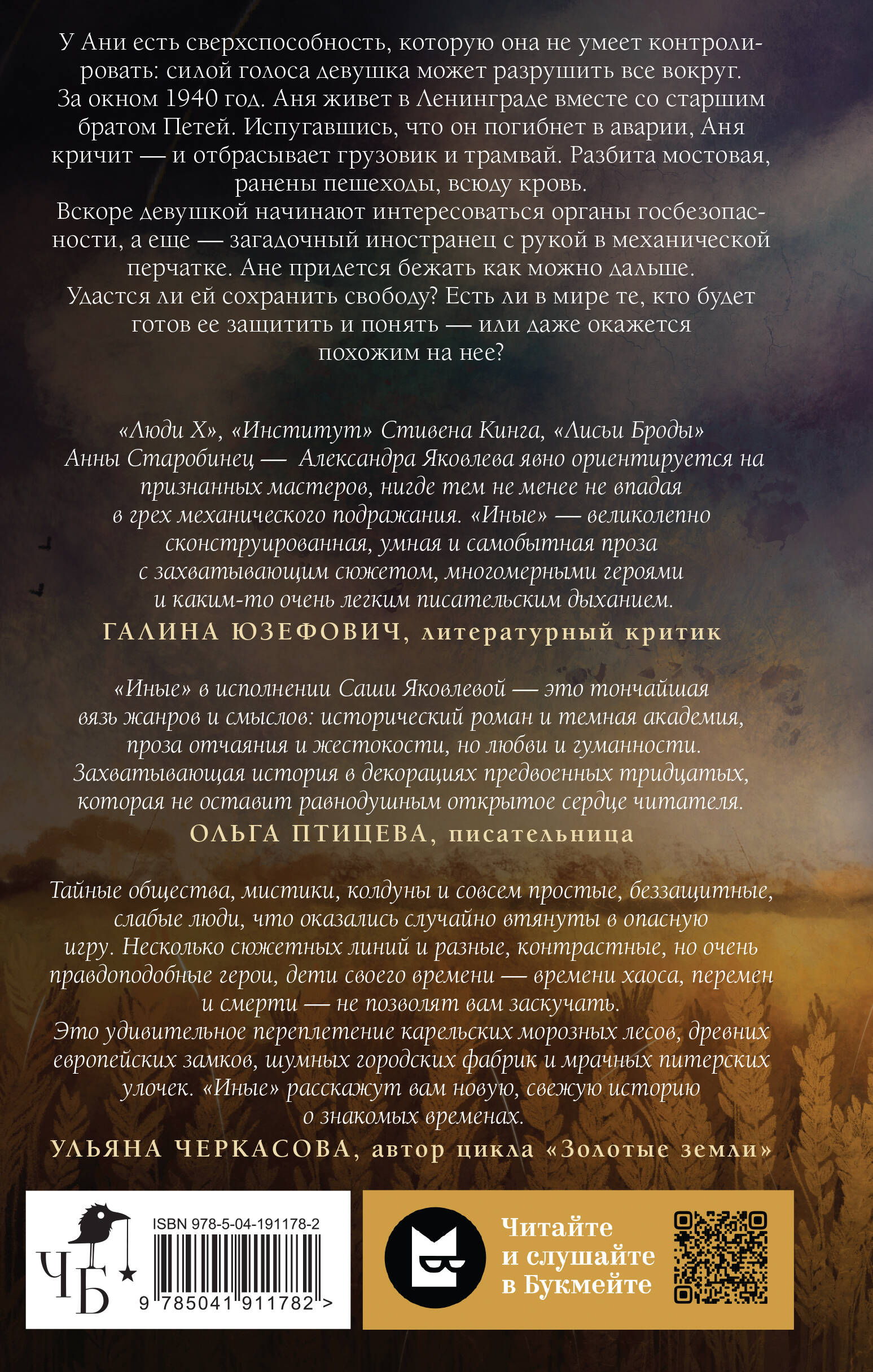 У Ани есть сверхспособность, которую она не умеет контролировать: силой голоса девушка может разрушить все вокруг. За окном 1940 год. Аня живет в Ленинграде вместе со старшим братом Петей. Испугавшись, что он погибнет в аварии, Аня кричит - и отбрасывает грузовик и трамвай. Разбита мостовая, ранены пешеходы, всюду кровь. Вскоре девушкой начинают интересоваться органы госбезопасности, а еще - загадочный иностранец с рукой в механической перчатке. Ане придется бежать как можно дальше. Удастся ли ей сохранить свободу? Есть ли в мире те, кто будет готов ее защитить и понять - или даже окажутся похожими на нее? «Иные» - совместный проект Черным-бело и Букмейта, часть огромной медиа-вселенной, включающей в себя роман-историю, готовящийся к выходу одноименный сериал и комикс от BUBBLE. Аудиокнига для проекта записана участницей группы «АИГЕЛ». Удивительный остросюжетный фэнтези-роман, события которого разворачиваются в тяжёлый для всего мира период - первые годы Второй мировой войны. Несколько рассказчиков помогут рассмотреть многослойный сюжет с разных сторон. Загадки, приключения, тяжёлые судьбы, выбор, борьба. И люди со сверхспособностями.