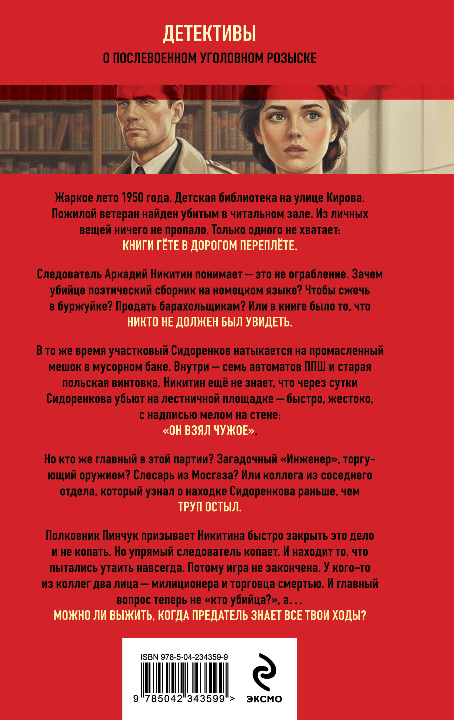 Послевоенный детектив о предательстве, оружии и тайне старой книги. Жаркое лето 1950 года. Детская библиотека на улице Кирова. Пожилой ветеран найден убитым в читальном зале. Из личных вещей ничего не пропало. Только одного не хватает: КНИГИ ГЁТЕ В ДОРОГОМ ПЕРЕПЛЁТЕ. Следователь Аркадий Никитин понимает - это не ограбление. Зачем убийце поэтический сборник на немецком языке? Чтобы сжечь в буржуйке? Продать барахольщикам? Или в книге было то, что НИКТО НЕ ДОЛЖЕН БЫЛ УВИДЕТЬ. В то же время участковый Сидоренков натыкается на промасленный мешок в мусорном баке. Внутри - семь автоматов ППШ и старая польская винтовка. Никитин еще не знает, что через сутки Сидоренкова убьют на лестничной площадке - быстро, жестоко, с надписью мелом на стене: «ОН ВЗЯЛ ЧУЖОЕ». Но кто же главный в этой партии? Загадочный «Инженер», торгующий оружием? Слесарь из Мосгаза? Или коллега из соседнего отдела, который узнал о находке Сидоренкова раньше, чем ТРУП ОСТЫЛ. Полковник Пинчук призывает Никитина быстро закрыть это дело и не копать. Но упрямый следователь копает. И находит то, что пытались утаить навсегда. Потому игра не закончена. У кого-то из коллег два лица - милиционера и торговца смертью. И главный вопрос теперь не «кто убийца?», а… МОЖНО ЛИ ВЫЖИТЬ, КОГДА ПРЕДАТЕЛЬ ЗНАЕТ ВСЕ ТВОИ ХОДЫ?| Издательство | ООО "Издательство "Эксмо" |