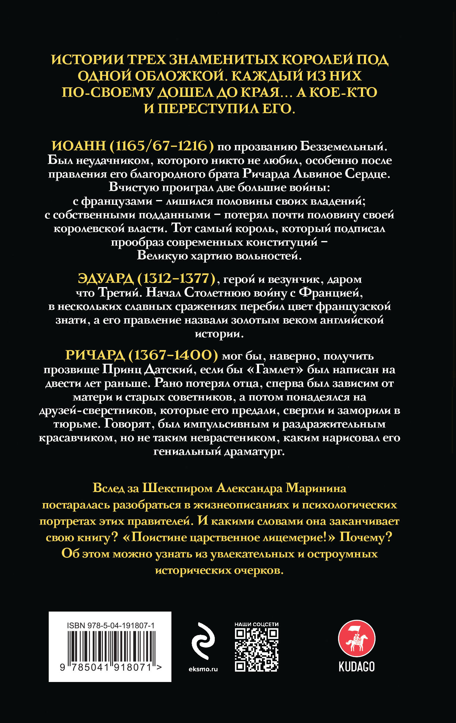 Истории трех знаменитых королей под одной обложкой. Каждый из них по-своему дошел до края… а кое-кто и переступил его. ИОАНН (1167-1216) по прозвищу Безземельный. Был неудачником, которого никто не любил, особенно после правления его благородного брата Ричарда Львиное Сердце. Вчистую проиграл две большие войны: с французами - лишился половины своих владений; с собственными подданными - потерял почти половину своей королевской власти. Тот самый король, который подписал прообраз современных конституций - Великую хартию вольностей. ЭДУАРД (1312-1377), герой и везунчик, по прозвищу Третий. Начал Столетнюю войну с Францией, в нескольких славных сраженьях перебил цвет французской знати, а его правление назвали «золотым веком» английской истории. РИЧАРД (1367-1400) мог бы, наверно, получить прозвище Принц Датский, если бы Гамлет был написан на двести лет раньше. Рано потерял отца, сперва был зависим от матери и старых советников, а потом понадеялся на друзей-сверстников, которые его предали, свергли и заморили в тюрьме. Говорят, был импульсивным и раздражительным красавчиком, но не таким неврастеником, каким нарисовал его гениальный драматург. Вслед за Шекспиром Александра Маринина постаралась разобраться в жизнеописаниях и психологических портретах этих правителей. И какими словами она заканчивает свою книгу? «Поистине царственное лицемерие!» Почему? Об этом можно узнать из увлекательных и остроумных исторических очерков.| Издательство | ООО "Издательство "Эксмо" |