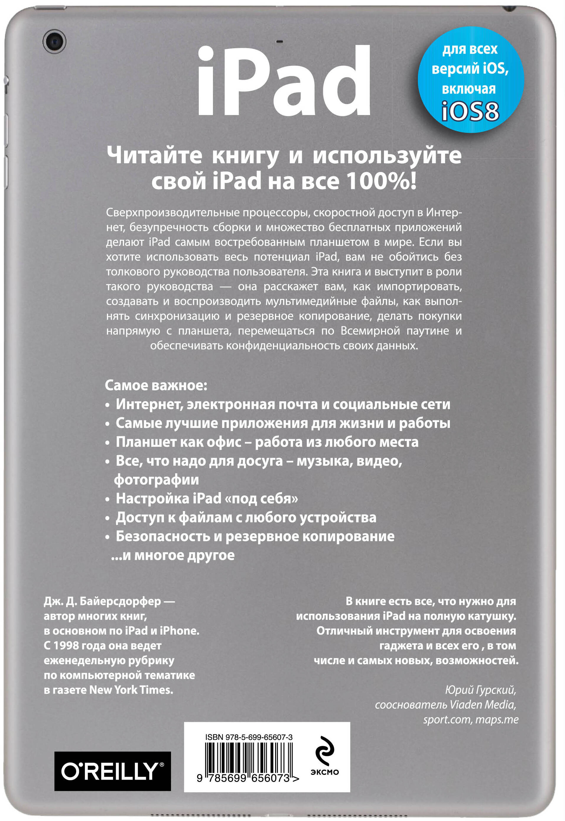 Читайте книгу и используйте свой iPAD на все 100%! Сверхпроизводительные процессоры, скоростной доступ в Интернет, безупречность сборки и множество бесплатных приложений делают iPad самым востребованным планшетом в мире. Если вы хотите использовать весь потенциал iPad, вам не обойтись без толкового руководства пользователя. Эта книга и выступит в роли такого руководства - она расскажет вам, как импортировать, создавать и воспроизводить мультимедийные файлы, как выполнять синхронизацию и резервное копирование, делать покупки напрямую с планшета, перемещаться по Всемирной паутине и обеспечивать конфиденциальность своих данных. Самое важное: • Интернет, электронная почта и социальнфые сети • Самые лучшие приложения для жизни и работы • Планшет как офис - работа из любого места • Все, что надо для досуга - музыка, видео, фотографиия • Настройка iPAD "под себя" • Доступ к файлам с любого устройства • Безопасность и резервное копирование ... и многое другое Подходит для всех версий iOS, в том числе и iOS8| Издательство | ООО "Издательство "Эксмо" |