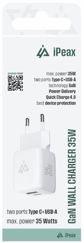 iPeax GaN 35W (USB-C + USB-A) white - это компактное и мощное зарядное устройство нового поколения, использующее технологию GaN для эффективной и безопасной зарядки ваших устройств. С двумя портами: USB-C с поддержкой Power Delivery и PPS, а также USB-A с Quick Charge 3.0, оно обеспечивает быструю зарядку для смартфонов, планшетов и других гаджетов. Идеально подходит для путешествий благодаря своему компактному размеру и универсальности.