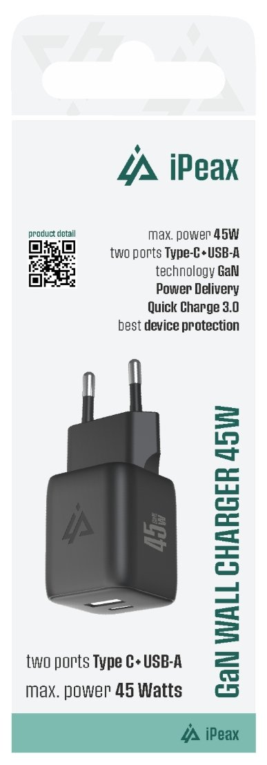 Сетевое зарядное устройство iPEAX мощностью 45 Вт использует технологию GaN для обеспечения высокой мощности зарядки в компактном корпусе. Благодаря USB-C с поддержкой Power Delivery и PPS, а также USB-A с поддержкой Qualcomm Quick Charge 3.0, оно идеально подходит для быстрой и безопасной зарядки смартфонов, планшетов, ноутбуков и других устройств.