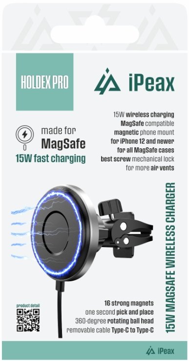 iPEAX Holdex Pro автомобильный держатель с беспроводной зарядкой и поддержкой MagSafe. Крепится на вентиляционную решетку автомобиля, надежно удерживает смартфон и обеспечивает удобную зарядку во время поездки. Компактный и современный дизайн подходит для большинства современных смартфонов.