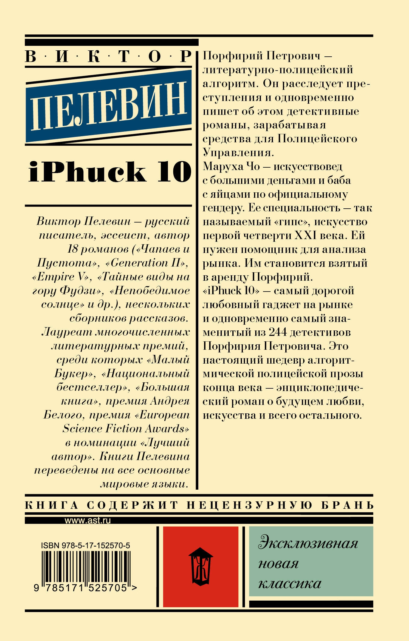 Порфирий Петрович - литературно-полицейский алгоритм. Он расследует преступления и одновременно пишет об этом детективные романы, зарабатывая средства для Полицейского Управления. Маруха Чо - искусствовед с большими деньгами и баба с яйцами по официальному гендеру. Ее специальность - так называемый "гипс", искусство первой четверти XXI века. Ей нужен помощник для анализа рынка. Им становится взятый в аренду Порфирий. "iPhuck 10" - самый дорогой любовный гаджет на рынке и одновременно самый знаменитый из 244 детективов Порфирия Петровича. Это настоящий шедевр алгоритмической полицейской прозы конца века - энциклопедический роман о будущем любви, искусства и всего остального.| Издательство | ИЗДАТЕЛЬСТВО "АСТ" |